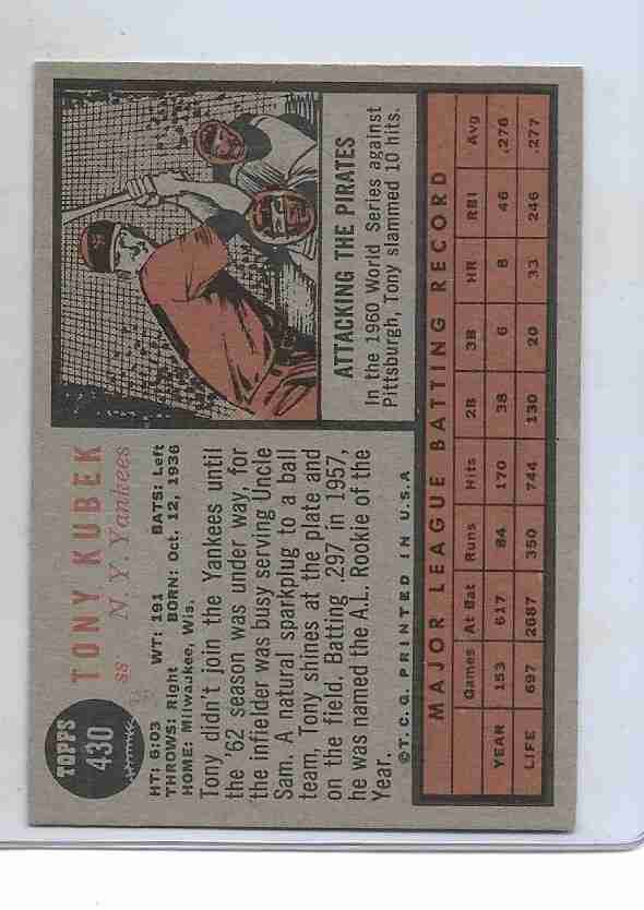 1962 Topps #430 ~ Tony Kubek New York Yankees