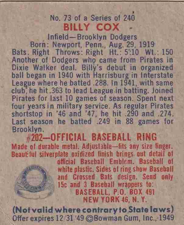 1949 Bowman #73 Billy Cox Brooklyn Dodgers