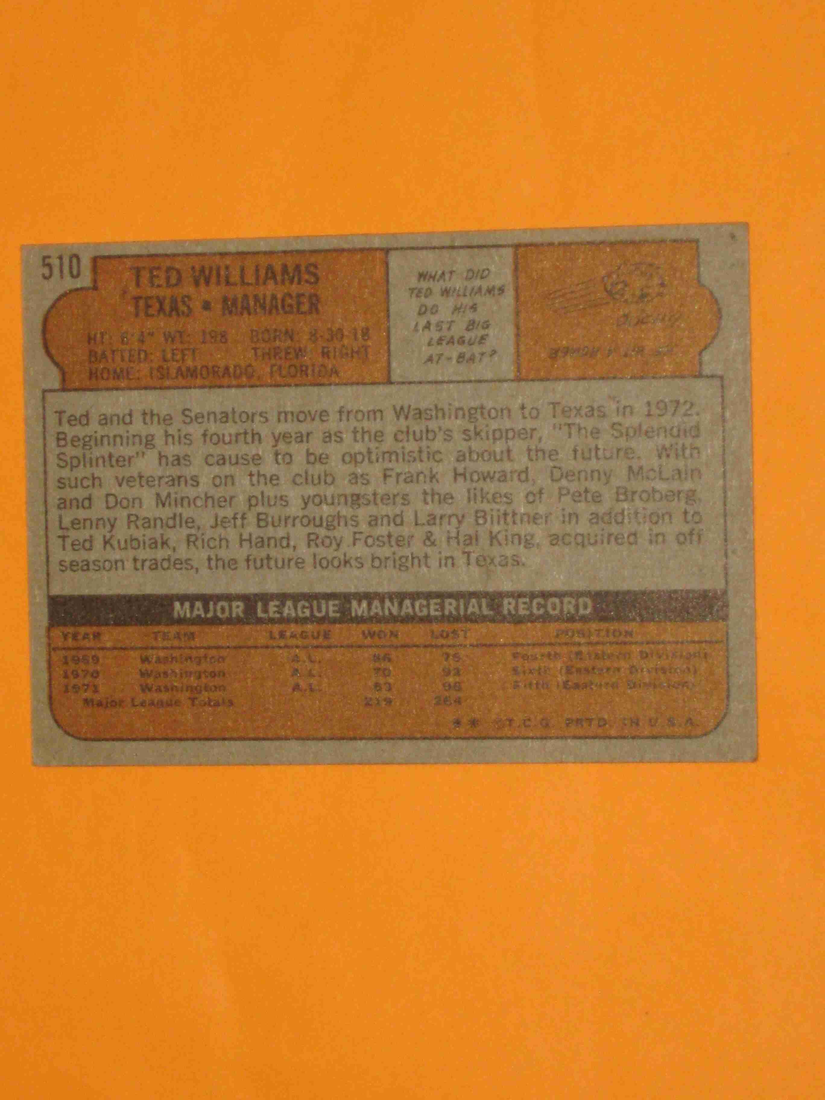1972 Topps Ted Williams #510 Texas Rangers NICE