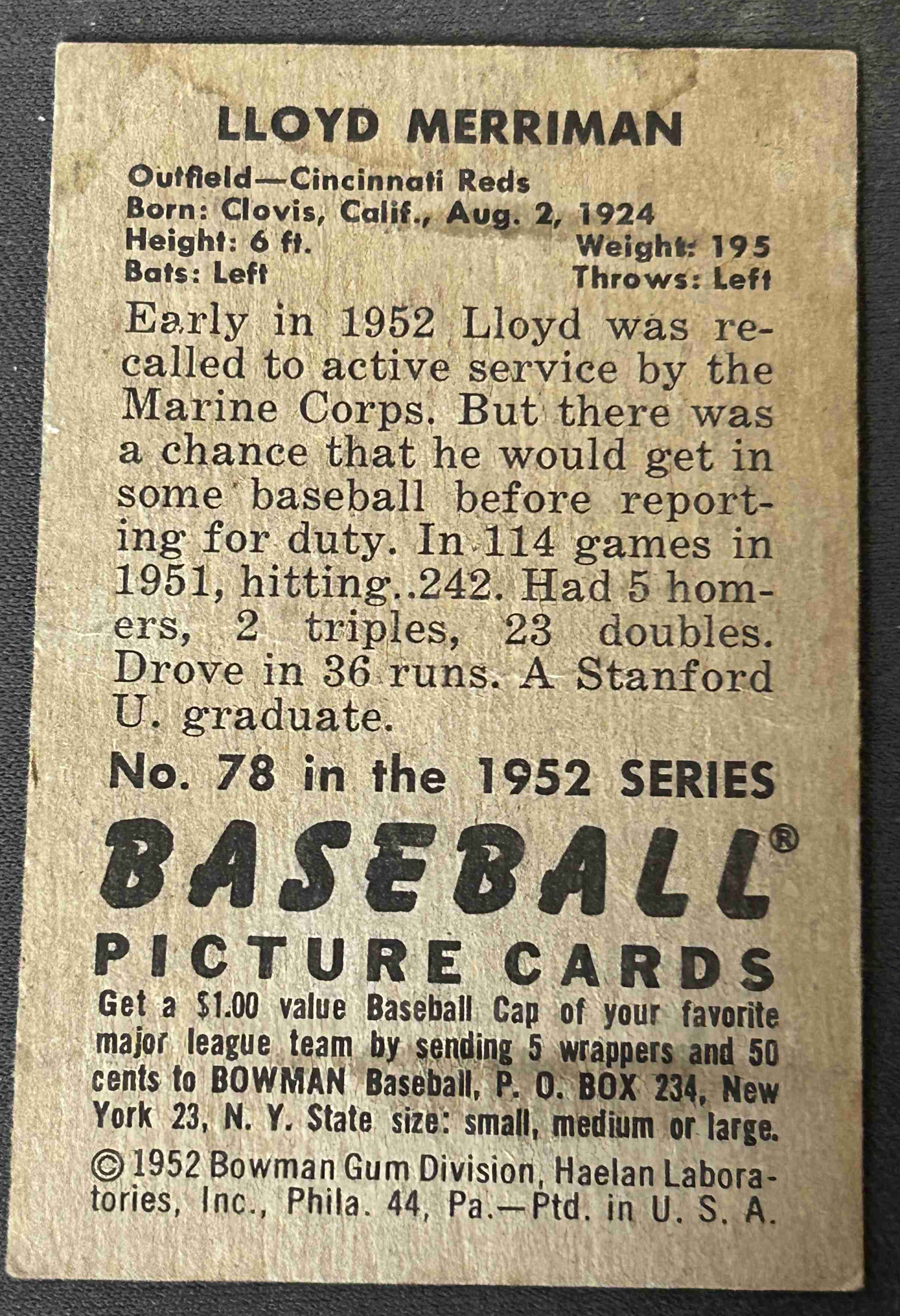 1952 Bowman Baseball Lloyd Merriman #78 EX condition. Shipped in PWE.