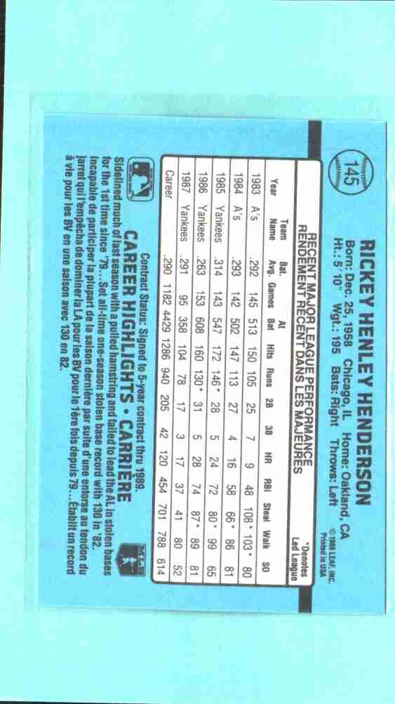 Rickey Henderson #145 1988 Leaf NY Yankees