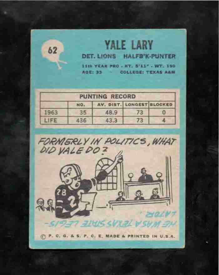 1964 Phil. Gum # 62 HOFer YALE LARY Detroit Lions