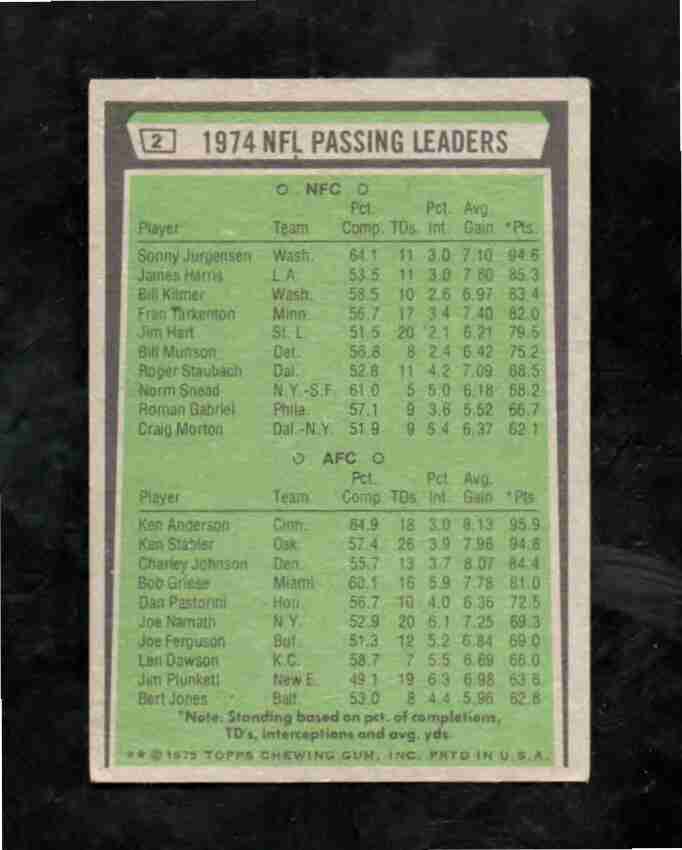 1975 Topps # 2 1974 Passing Ldrs. Jurgensen & Anderson