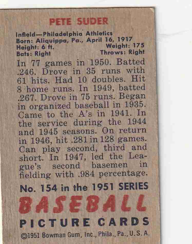 1951 Bowman #154 Pete Suder Philadelphia Athletics