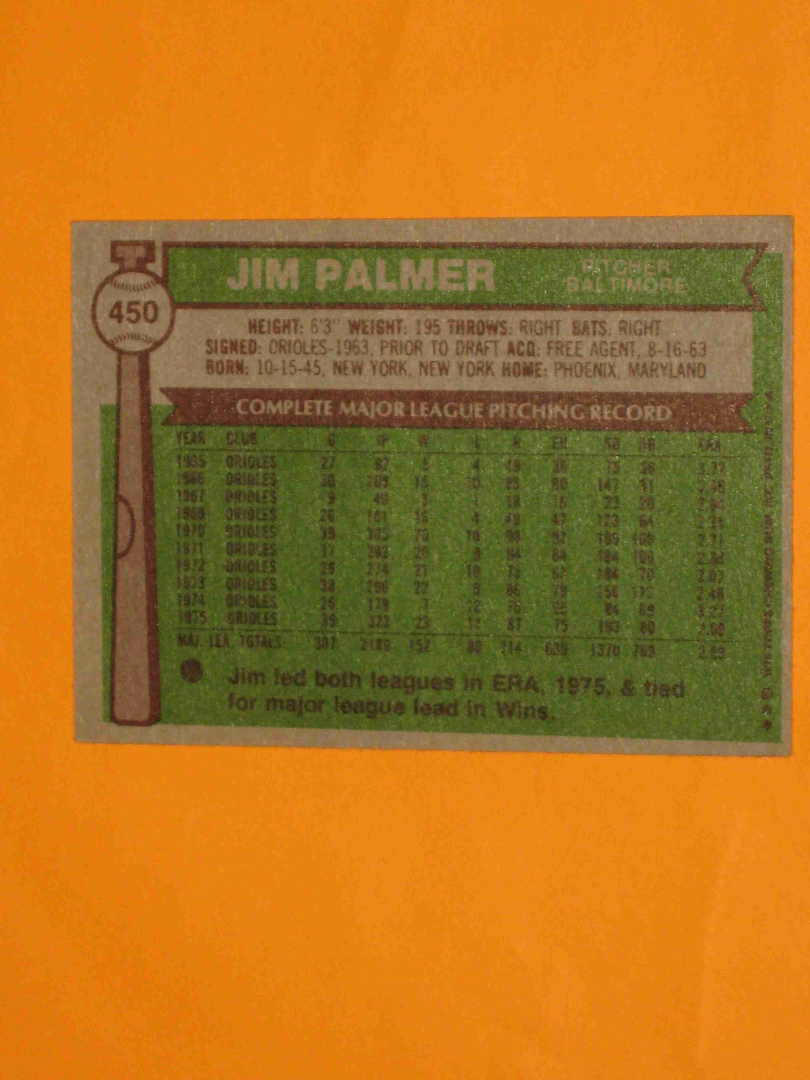 1976 Topps Jim Palmer #450 Baltimore Orioles NICE