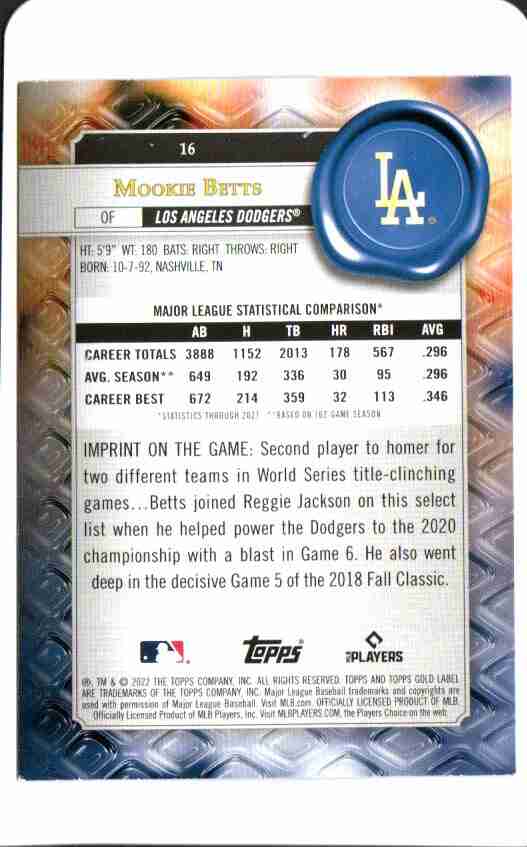 Mookie Betts [Class 1 Black] #16 2022 Topps Gold Label