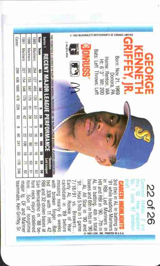 Ken Griffey jr #22 1992 Donruss McDonald's MVP