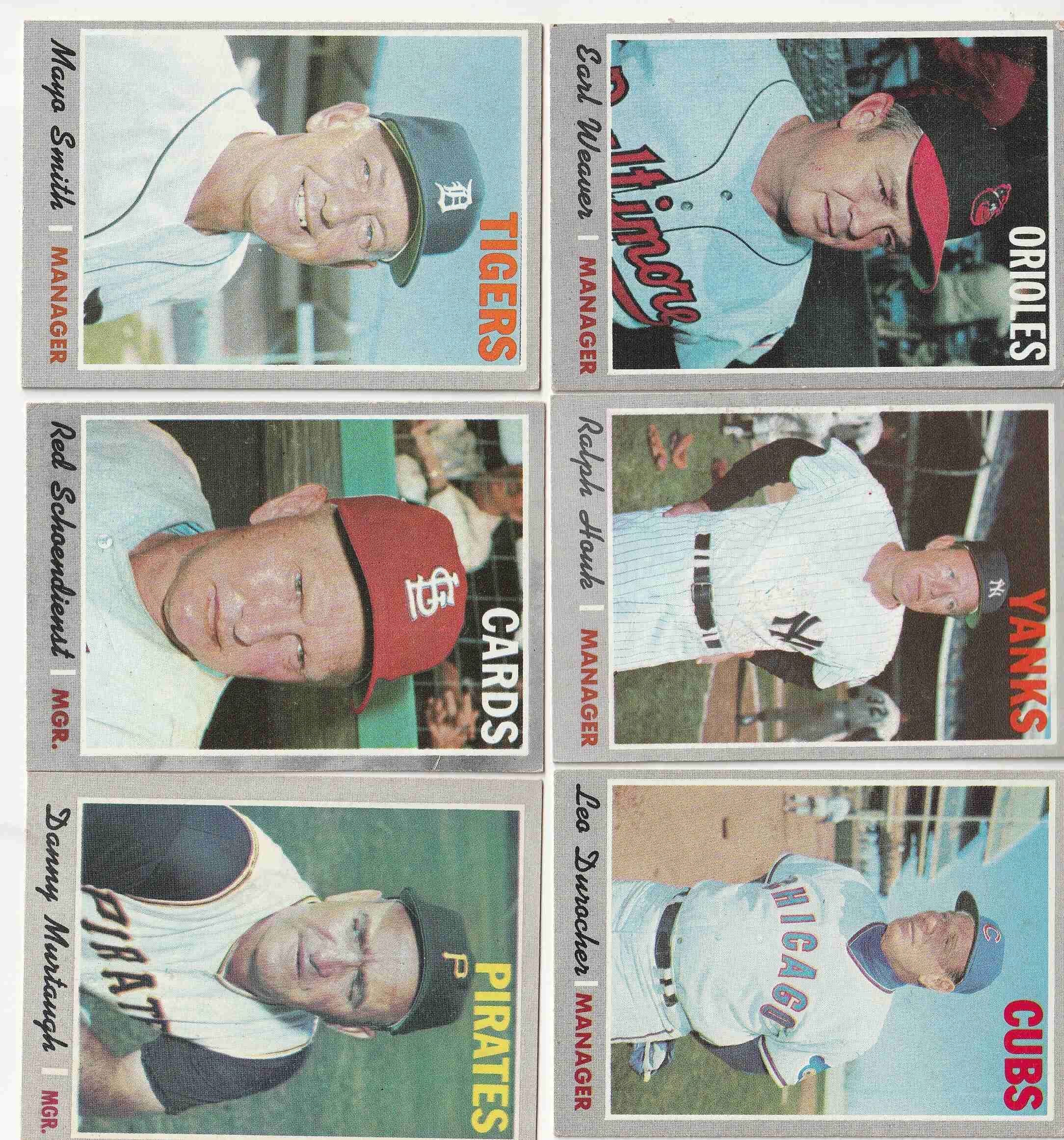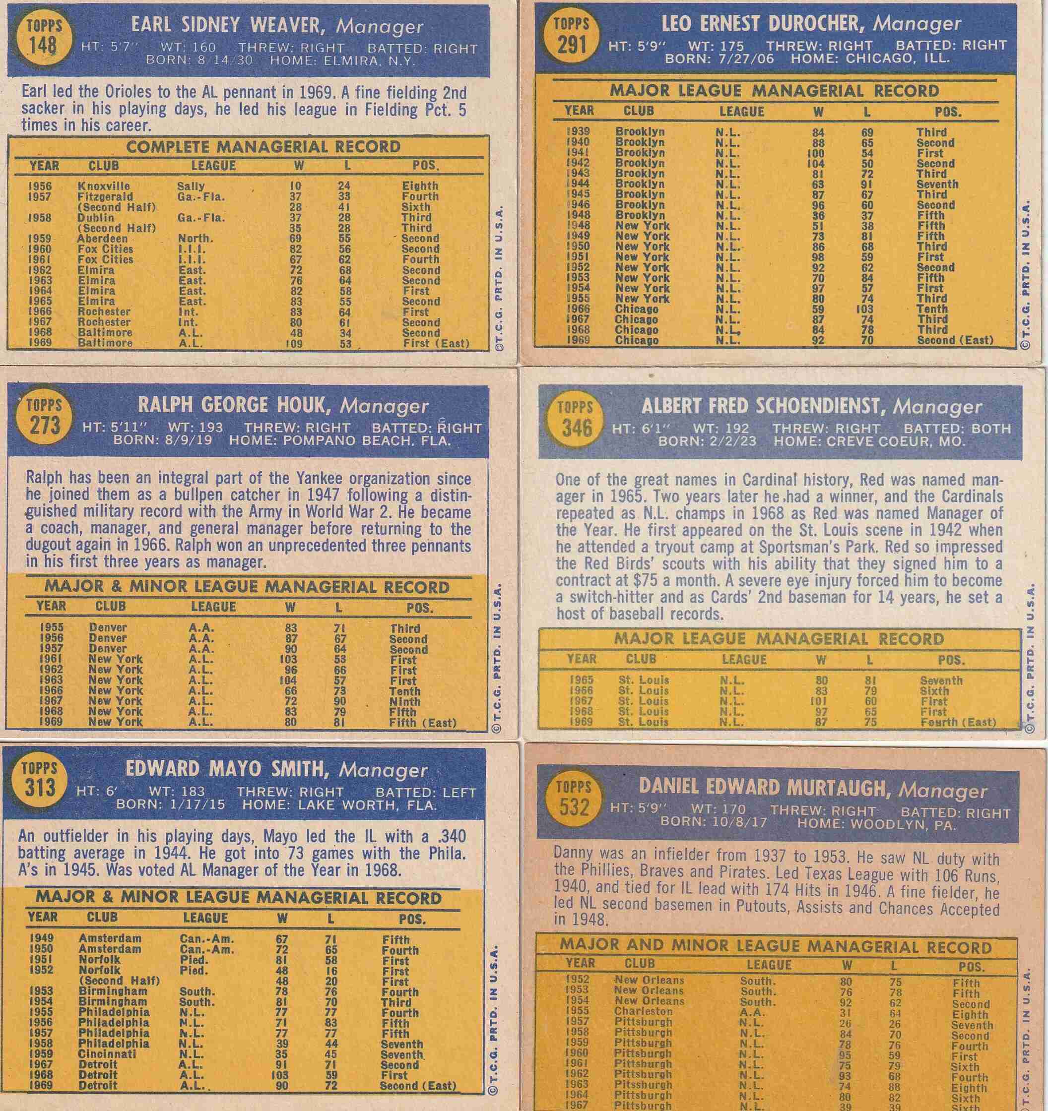 #148 Weaver (EX/EX+) #291 Durocher (EX/EX+) #273 Houk (EX/NM) #313 Smith (EX+) #346 Schoendienst (EX+) #532 Murtaugh (EX+) OC