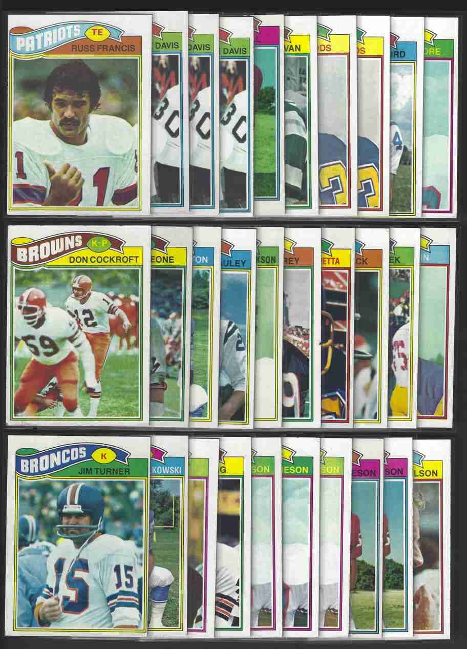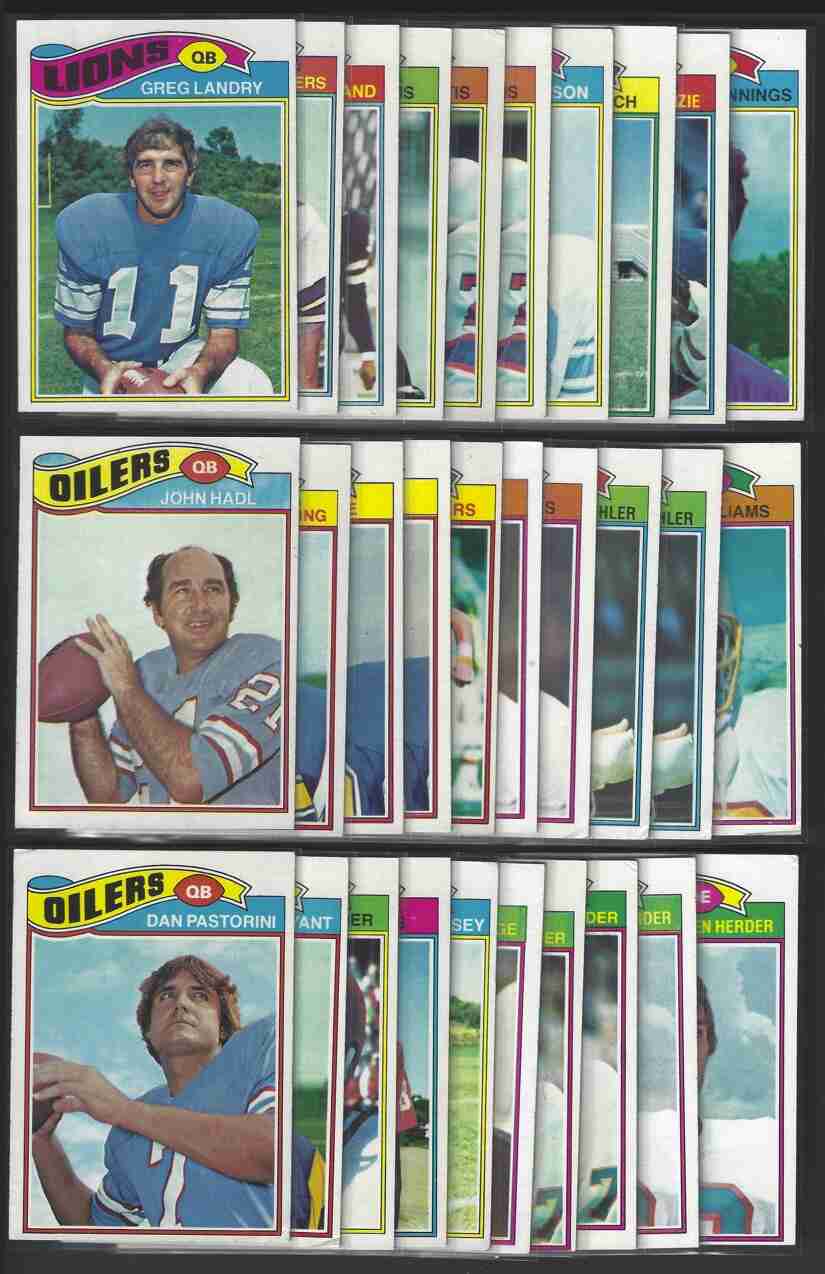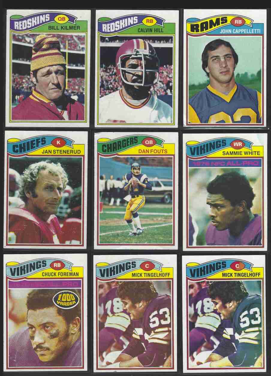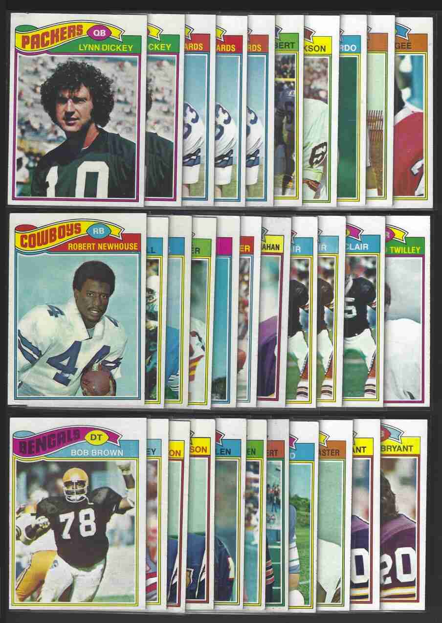 1977 Topps Football Lot (100). No's-15,17,35,38(2),43,47,48,49,57,83,97(2), 108(RC),109,112(2),136,137(2),148,149,154,151,161,176,187,194(2),233(2), 234(3),241,243,248(2),249,251,274(HOF),278,283,286,288,291(HOF-2),292,296, 304,308,313,329,335(HOF),340,343,344,347,348,352(3),358,361(2),362,367(3), 369,371,374,376(2),377,378,388,404,409,412,416.419,429,449(3),459,464,473, 475(2),483,491,495,497,500,502,508,512,521(2). There is some duplication. Mid to lower-grade lot. Please review scans carefully for condition.