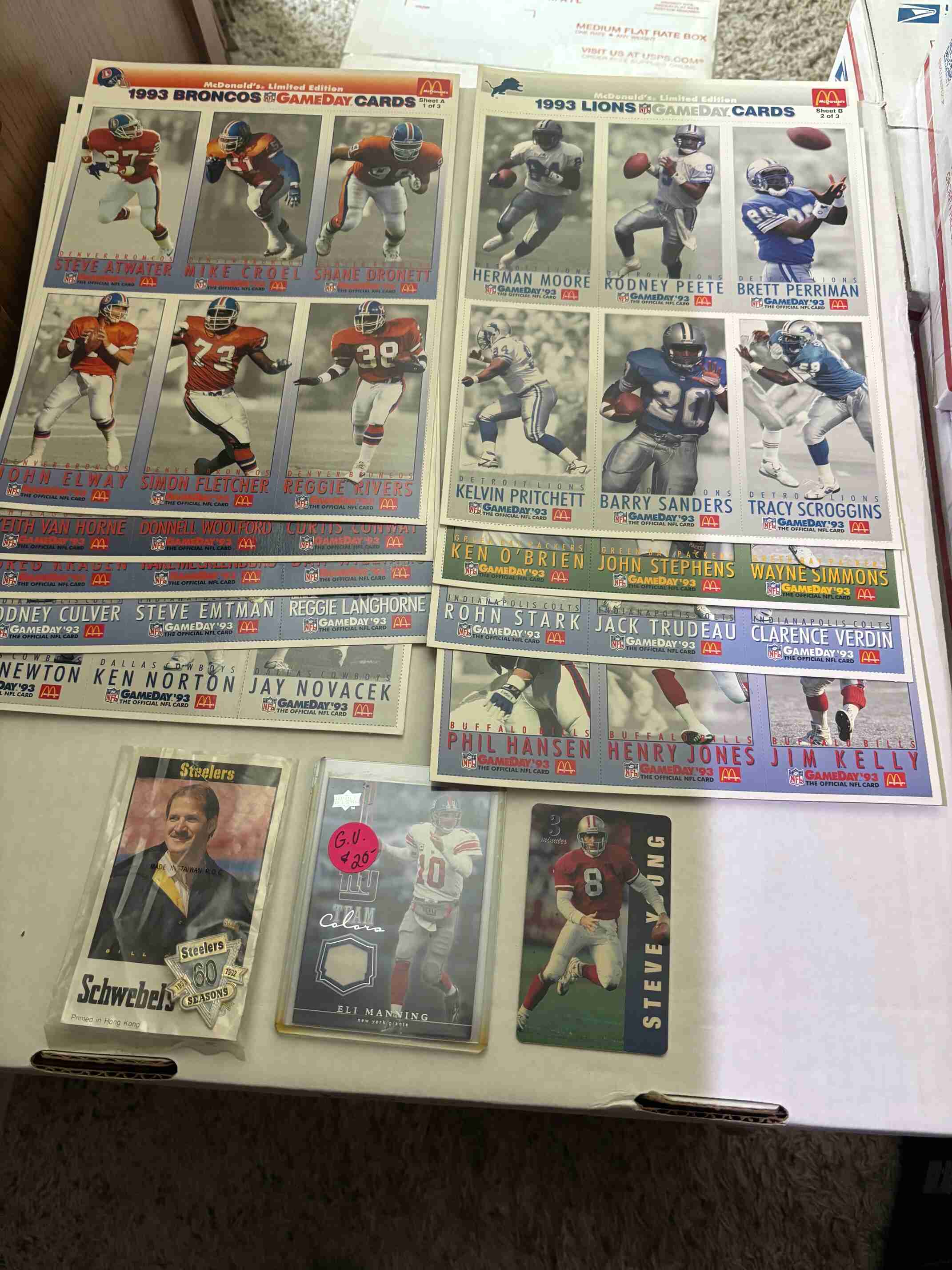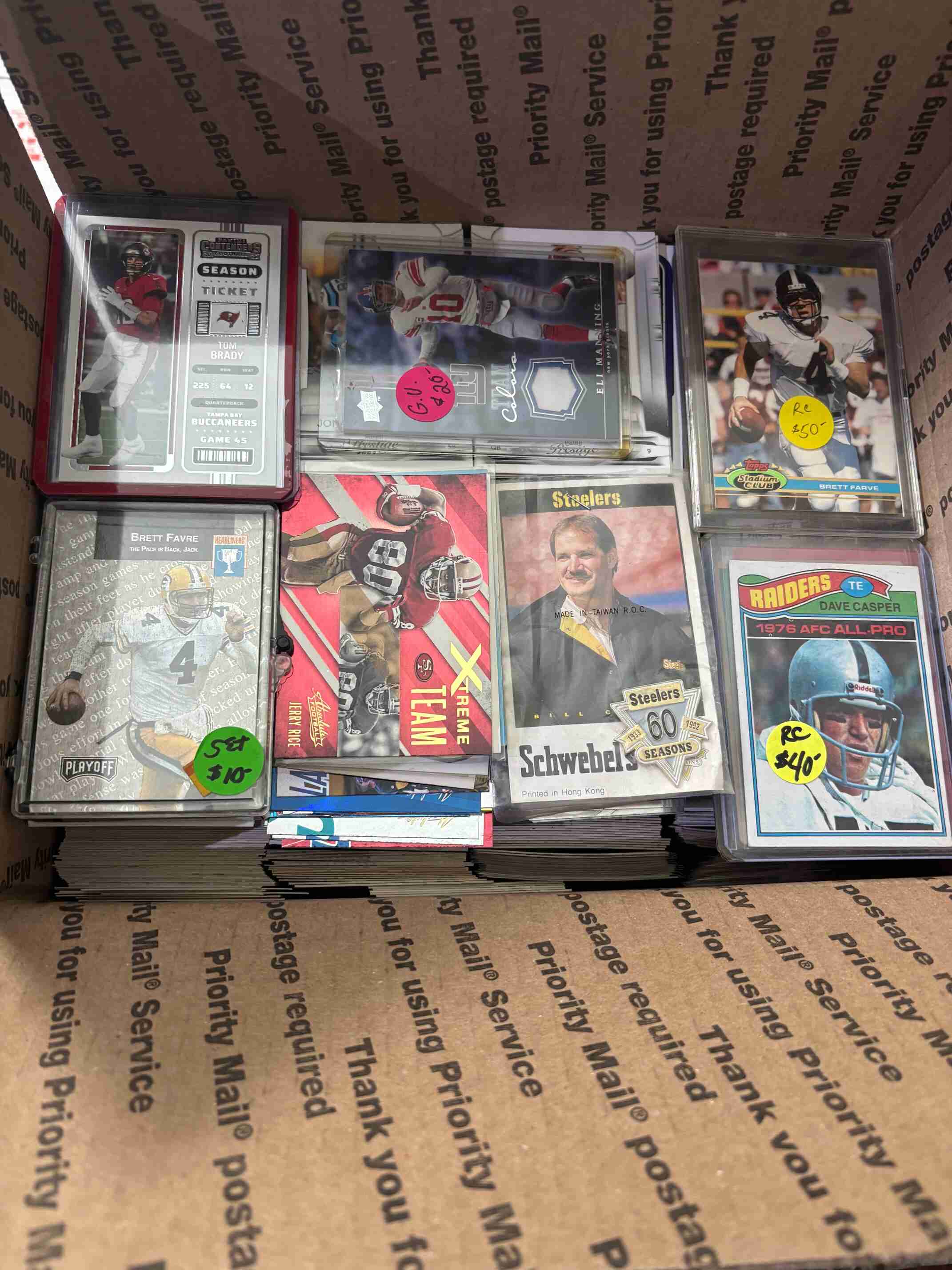 Huge collection of 2500 Football cards including a rare 50th Anniversary Pittsburgh Steelers pin in the original packaging, very high value vintage, Rookies, Stars. 9 uncut pages, an Eli Manning Game used card, and unopened packs, all in great condition. You will receive everything shown in the photos and more. I am having a complete clearance of my 2,000,000 card collection, so please check out my other auctions for more great deals.