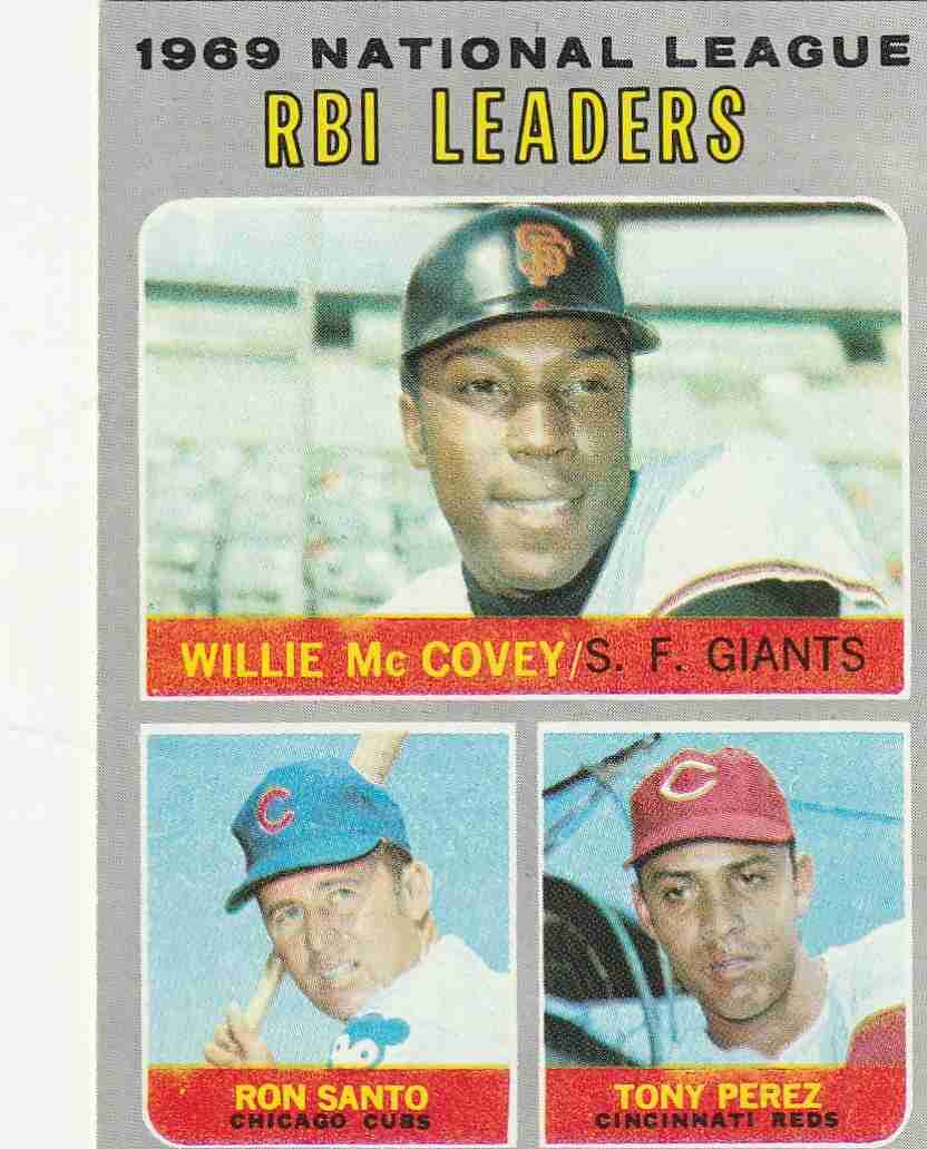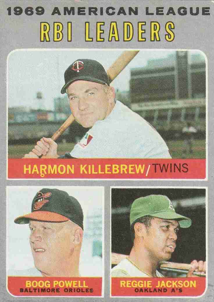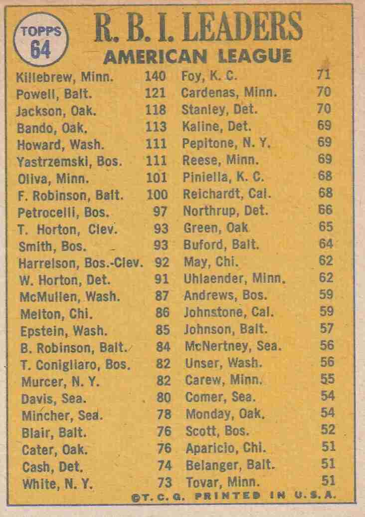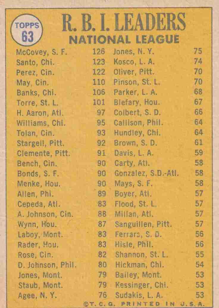 #63 NL RBI Leaders McCovey-Santo-Perez (EX/NM) #64 AL RBI Leaders Killebrew-Powell-Jackson (EX/EX+) border/tip minor blemishes