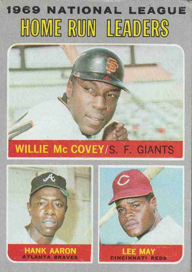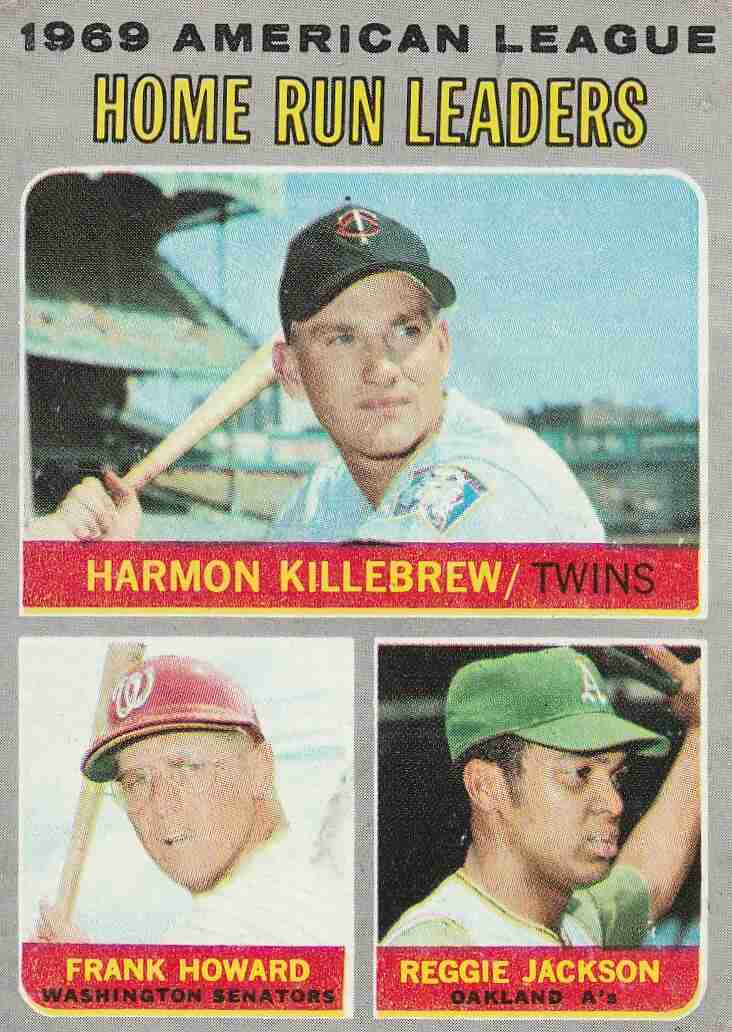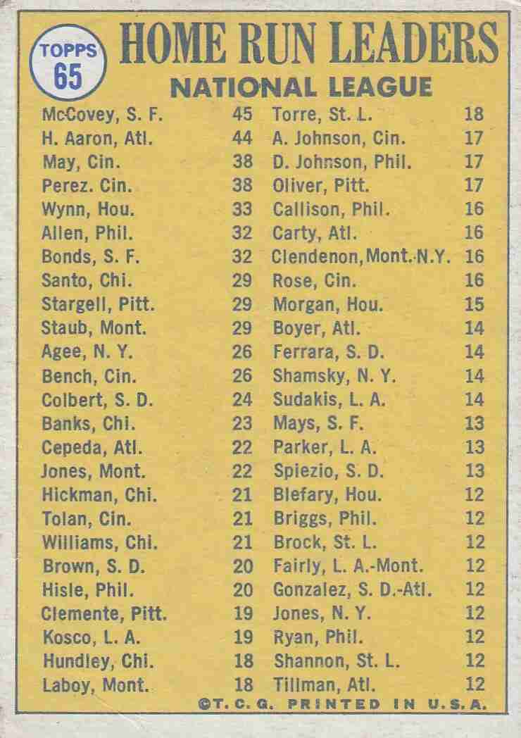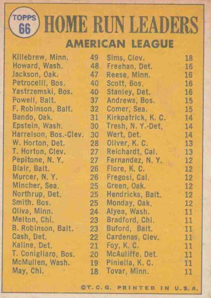#65 NL HR Leaders McCovey-Aaron-May (EX/EX+) border wear bottom//upper left corner tip #66 AL HR Leaders Killebrew-Howard-Jackson (EX/EX+) mild tip wear