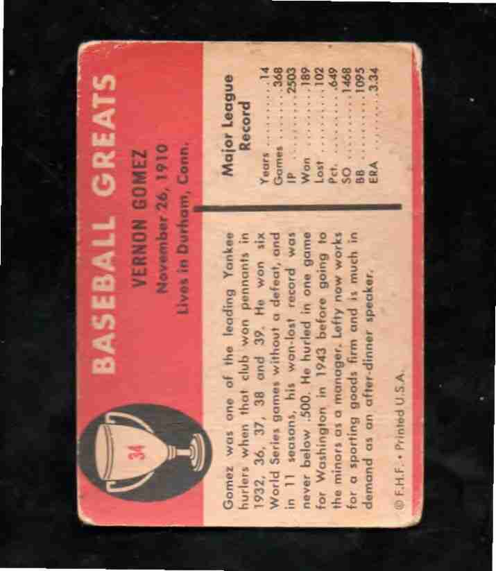 1961 Fleer Baseball Greats # 34 LEFTY GOMEZ
