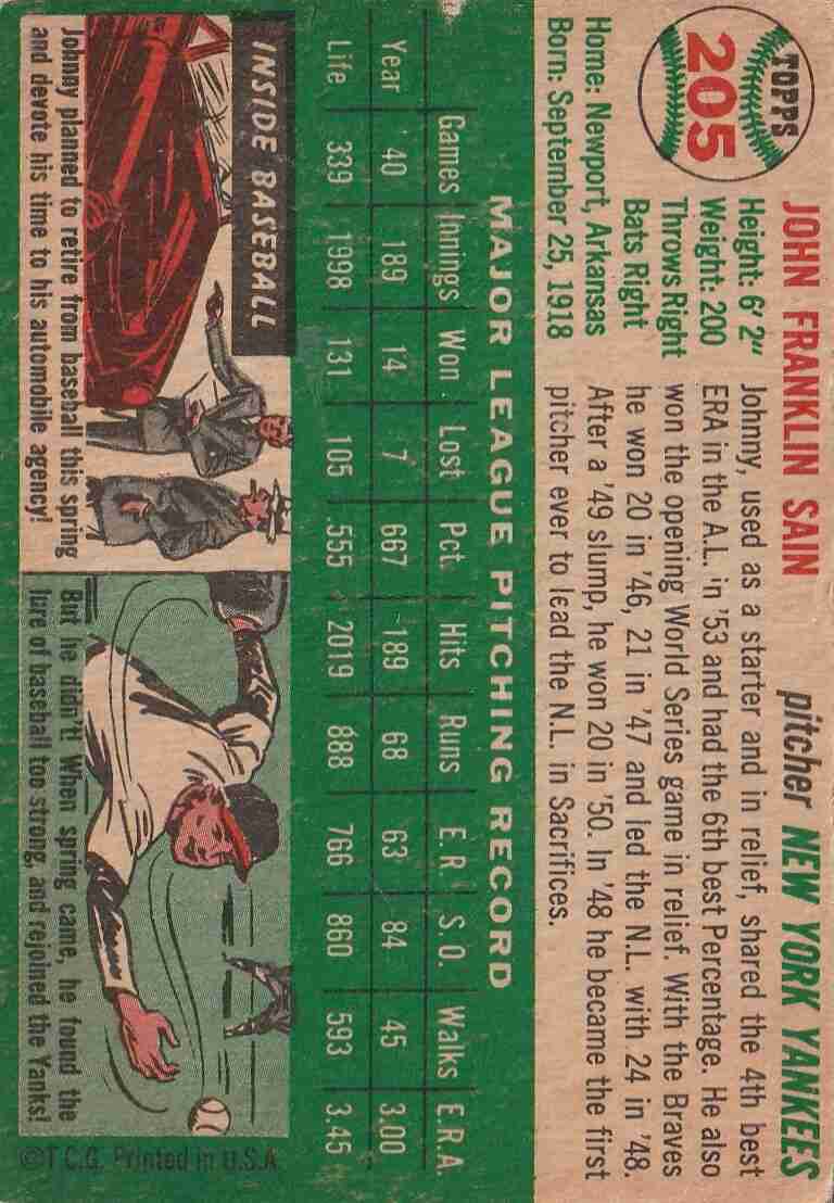1954 Topps #205 Johnny Sain NY Yankees