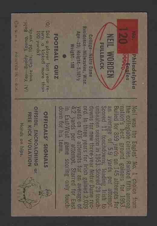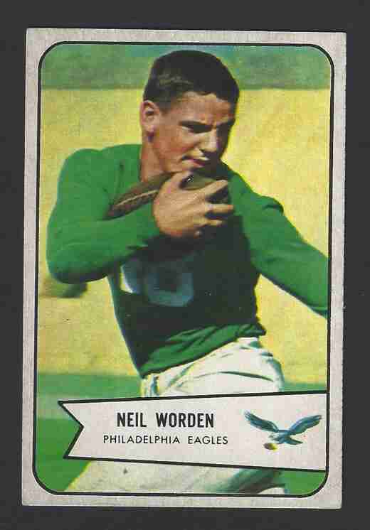 1954 Bowman Neil Worden -#120- Eagles. This is a higher-grade card. Card has minor flaws - nice corners. Nice shape for this era. Ships no tracking. Please review scans carefully for condition.