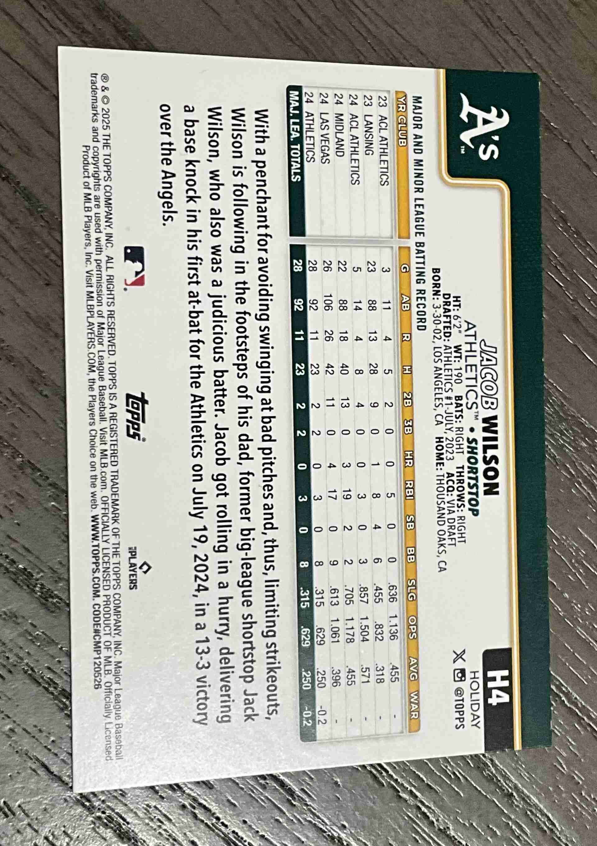 Jacob Wilson Rookie 2025 Topps Holiday H4 Athletics