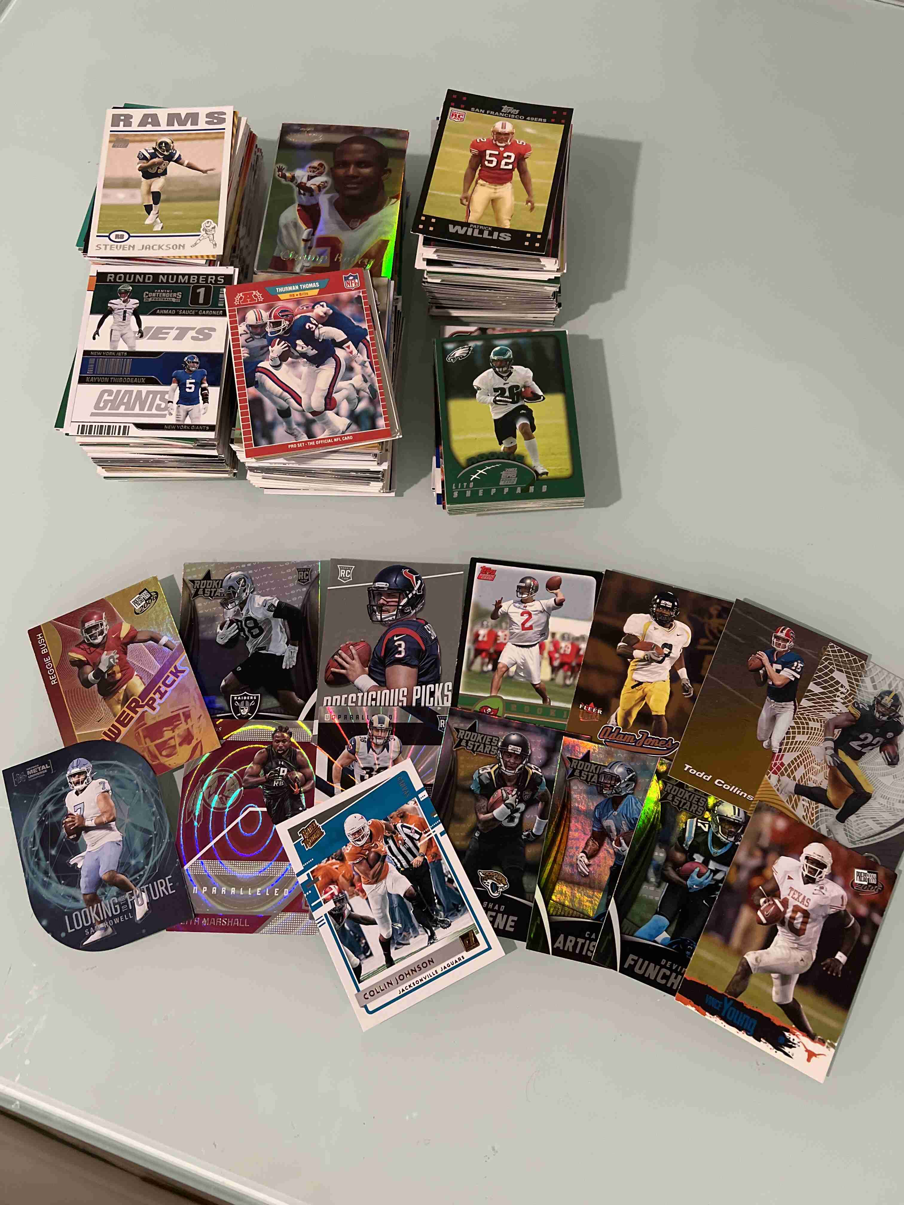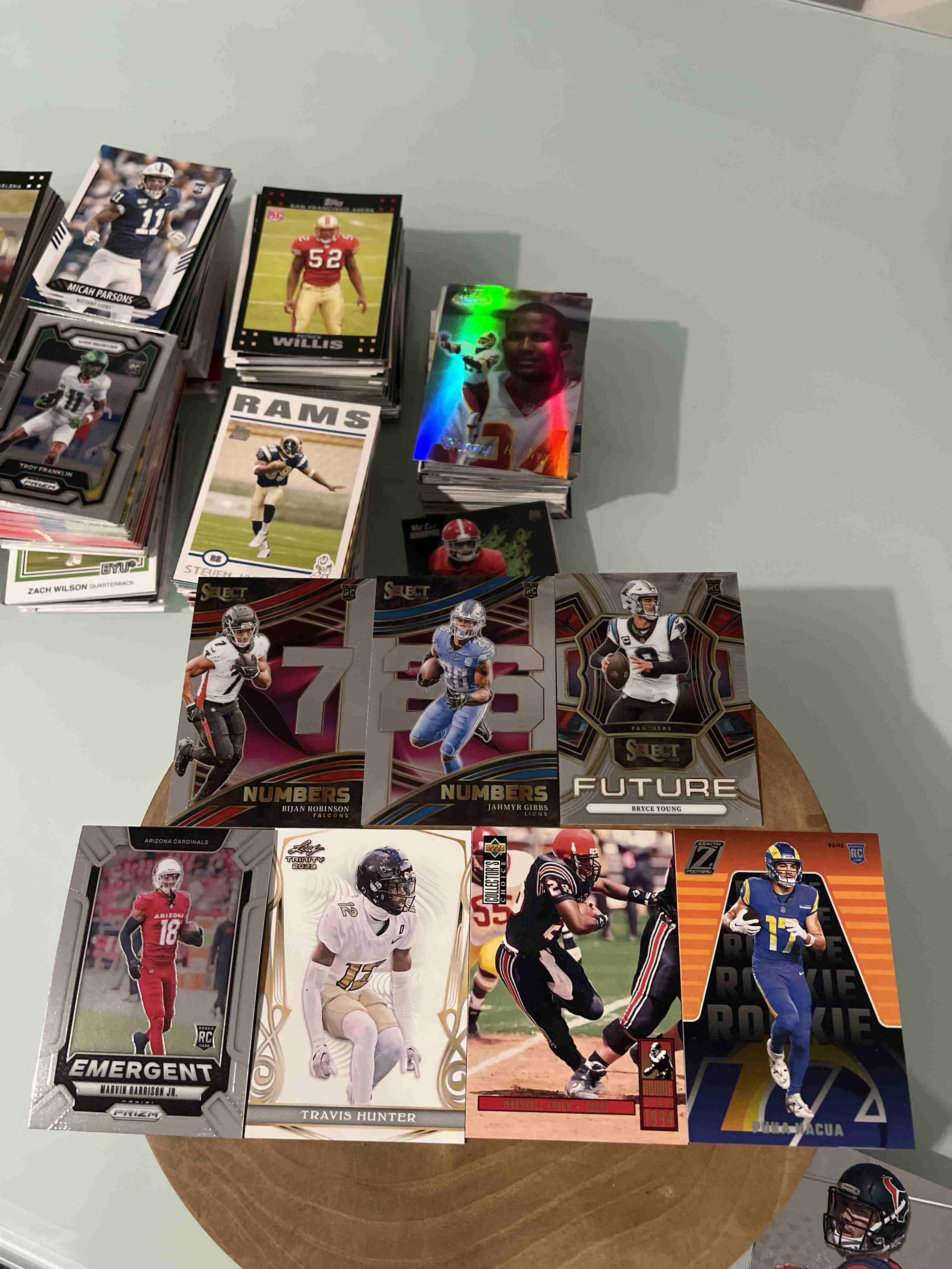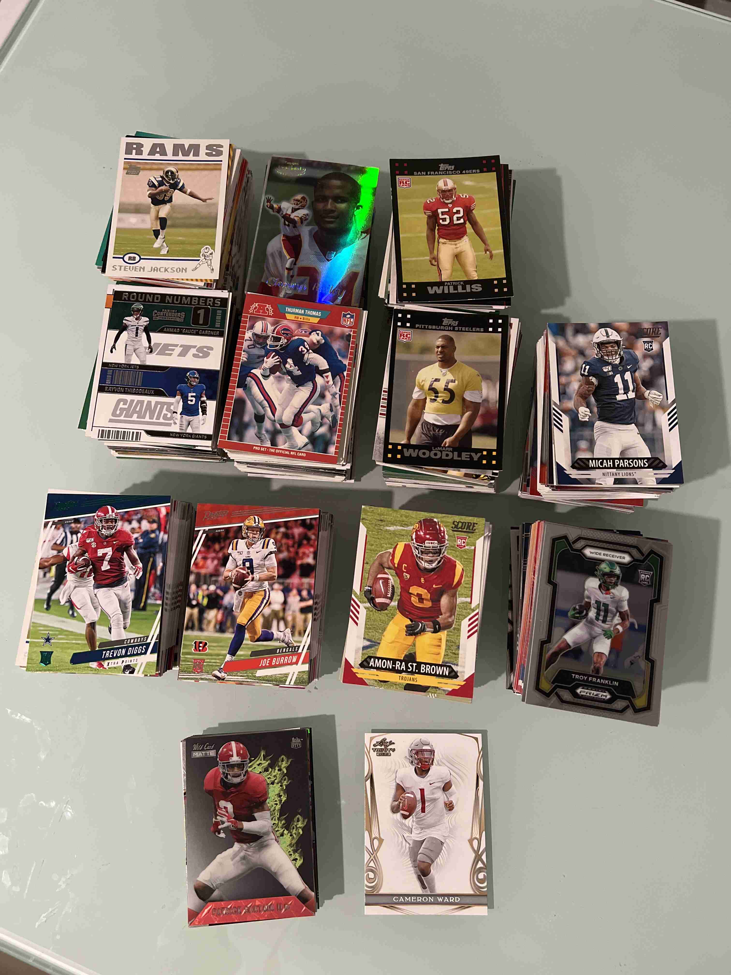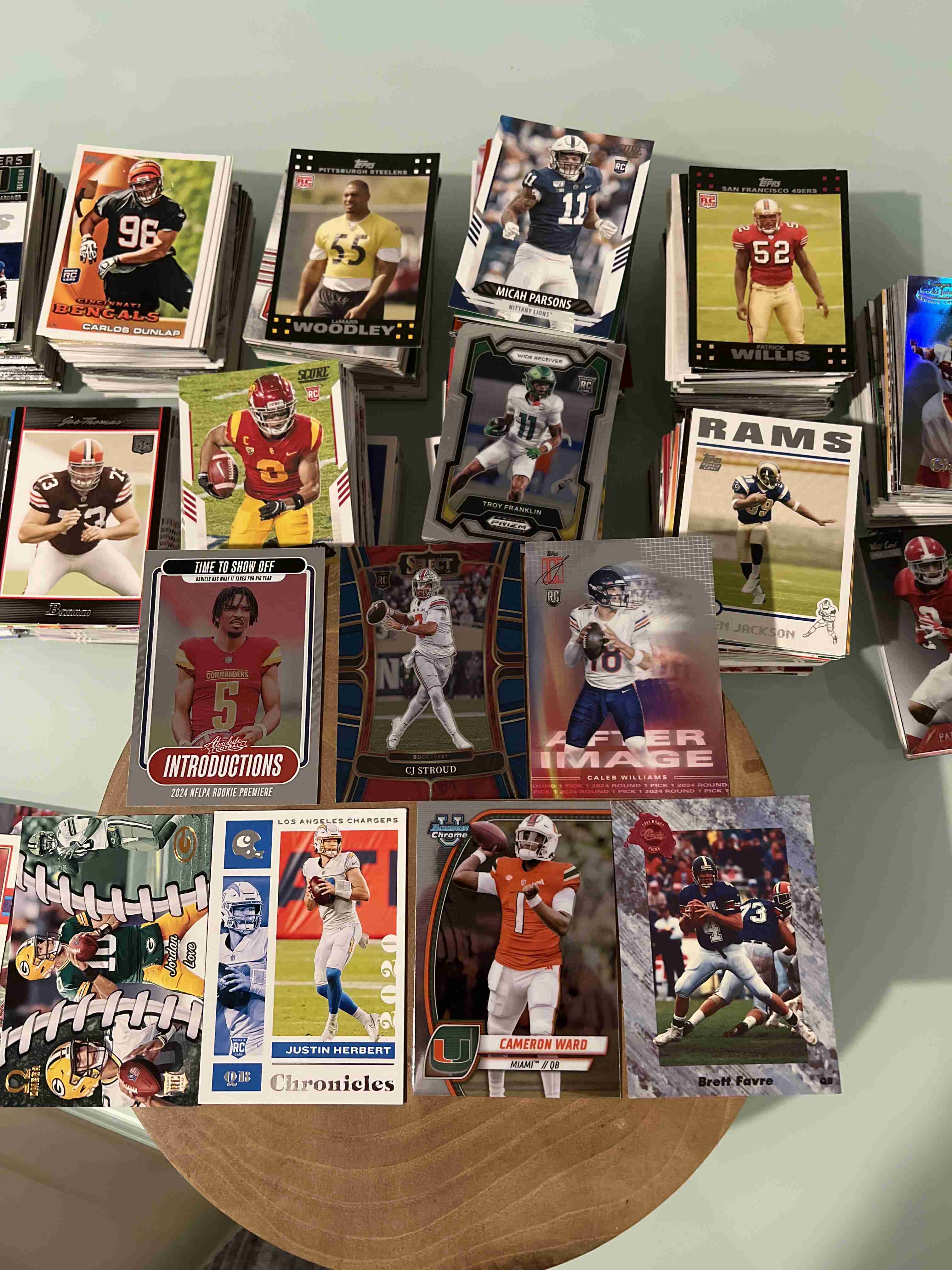 This auction is contains (1100+) of only RC's. Lot includes everything you see in all the pics. Which is #ED INSERT RC's vintage RC's and RC's of superstars... such as BIJAN Robinson, JAHMYR Gibbs, Joe Burrow, Jayden Daniels, Caleb, Williams, Micah Paraons, Jordan Love, Brett Favre, Sauce Gardner, CJ Stroud, Thurman Thomas, Marshall Faulk, Puca Nacua... and many more... AWESOME LOT TO GET!!!