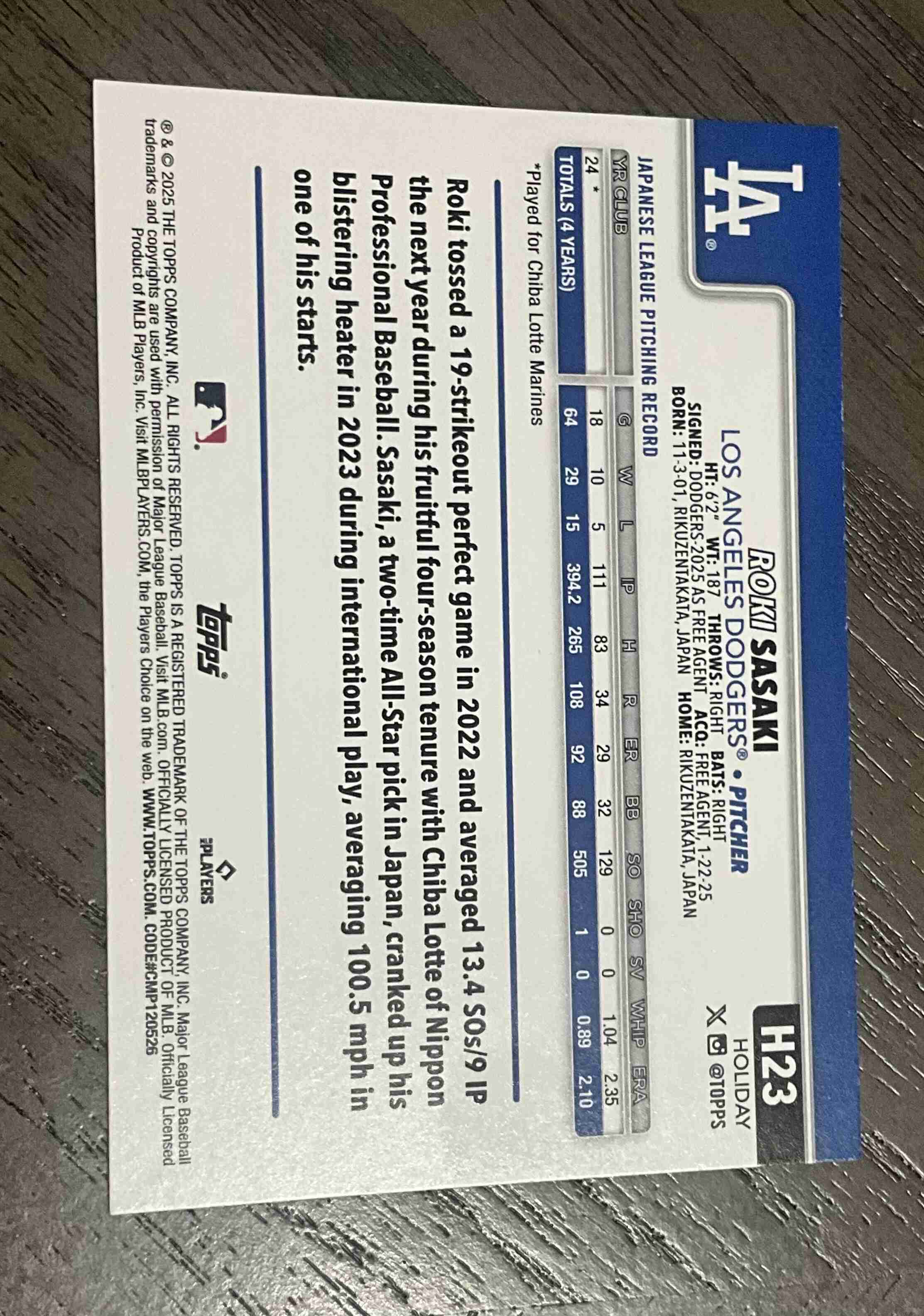 Roki Sasaki Rookie 2025 Topps Holiday H23 Dodgers