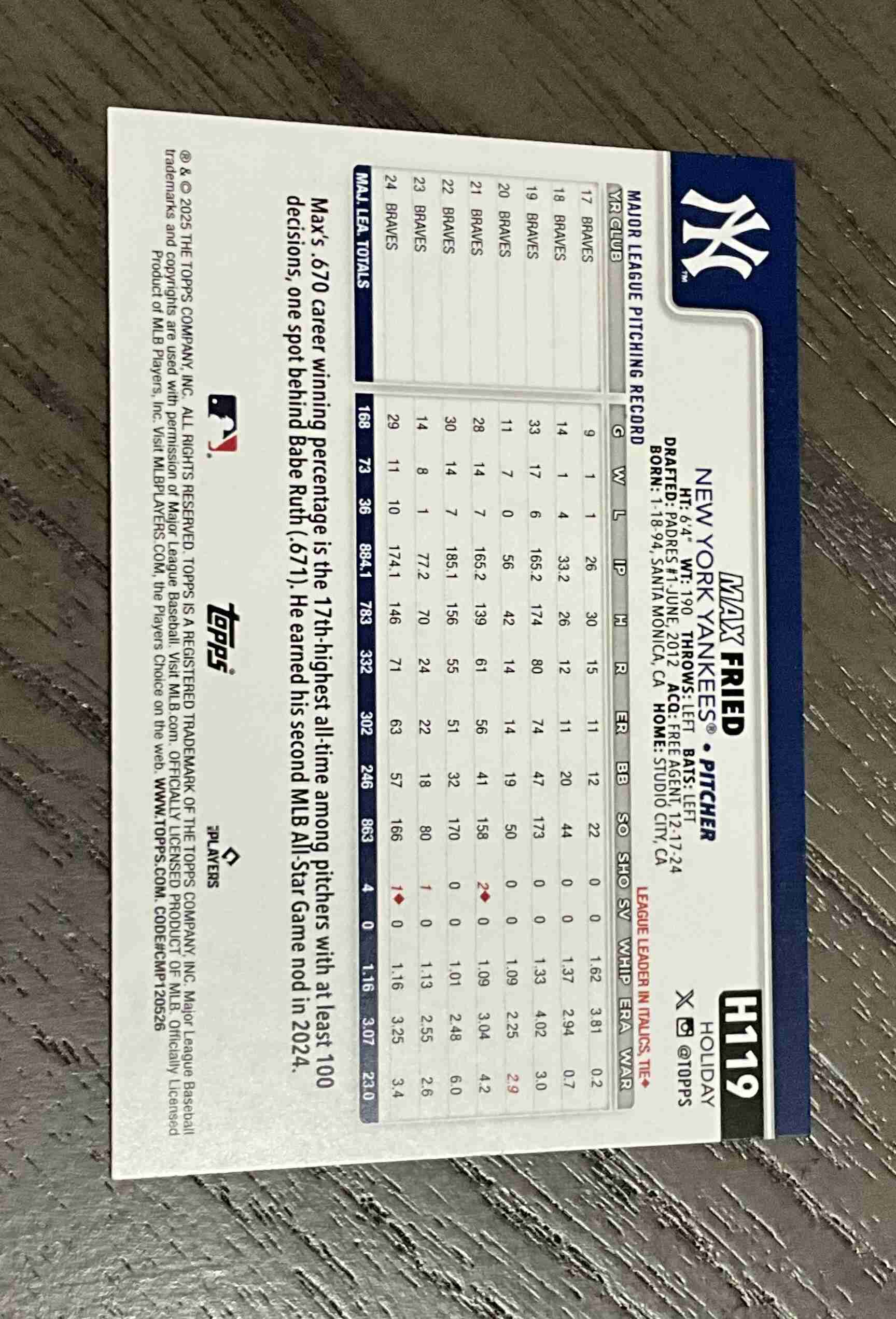 Max Fried Silver Glitter 2025 Topps Holiday H119 Yankees
