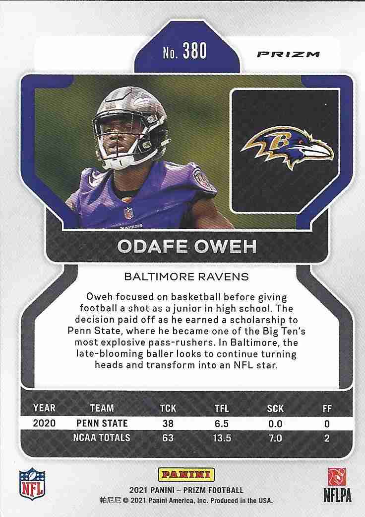 2021 Panini Prizm Prizms Purple Pulsar Rookie Card (#380) of the Penn State Nittany Lions and the Baltimore Ravens standout defensive lineman Odafe Oweh.