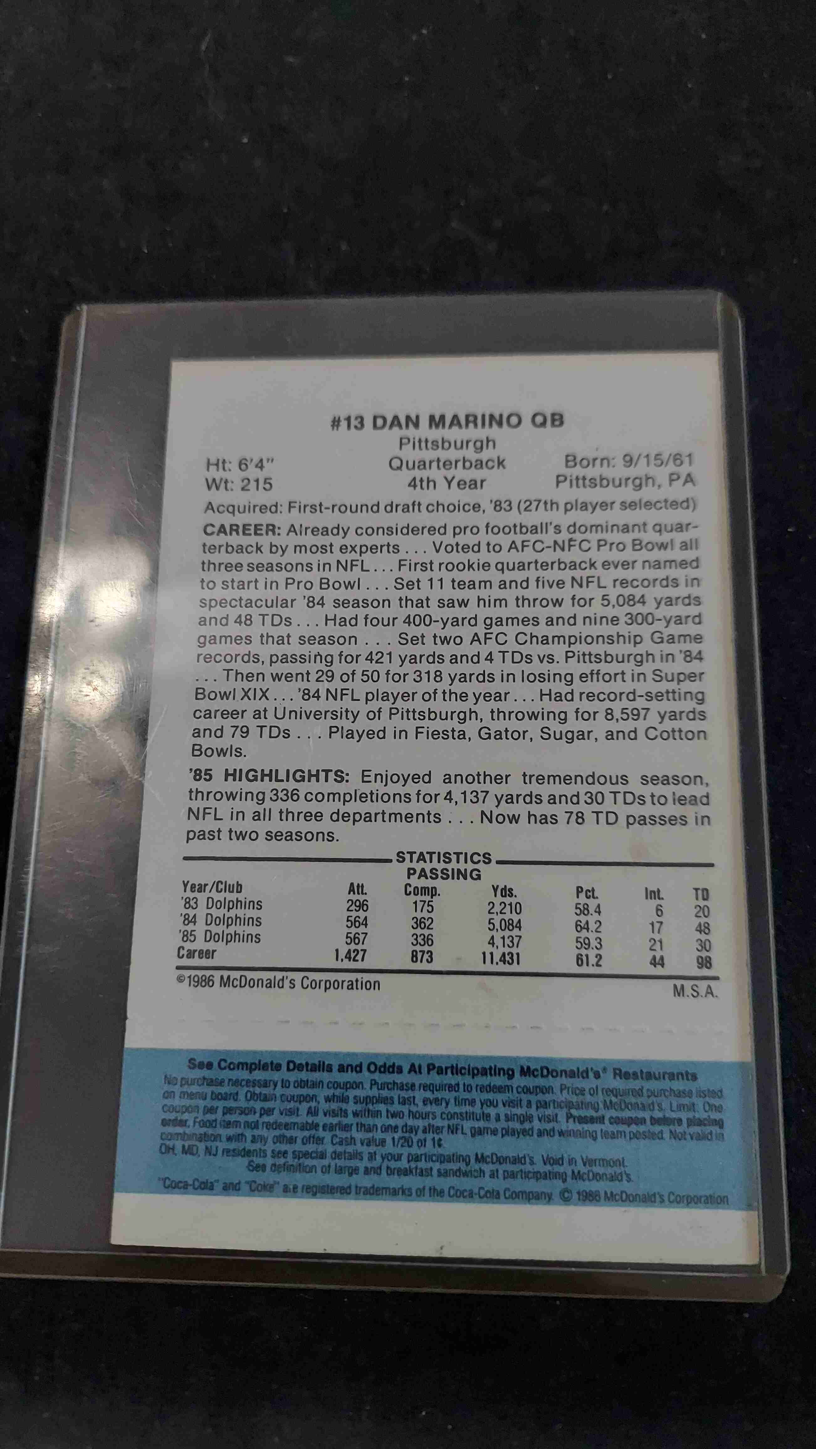 Dan marino 1986 Green unscratched mcdonalds with tab