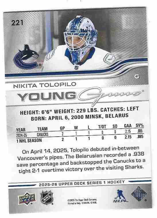 2025/26 UD 1 #221 NIKITA TOLOPILO YOUNG GUNS