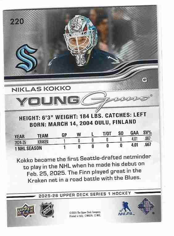 2025/26 UD 1 #220 NIKLAS KOKKO YOUNG GUNS