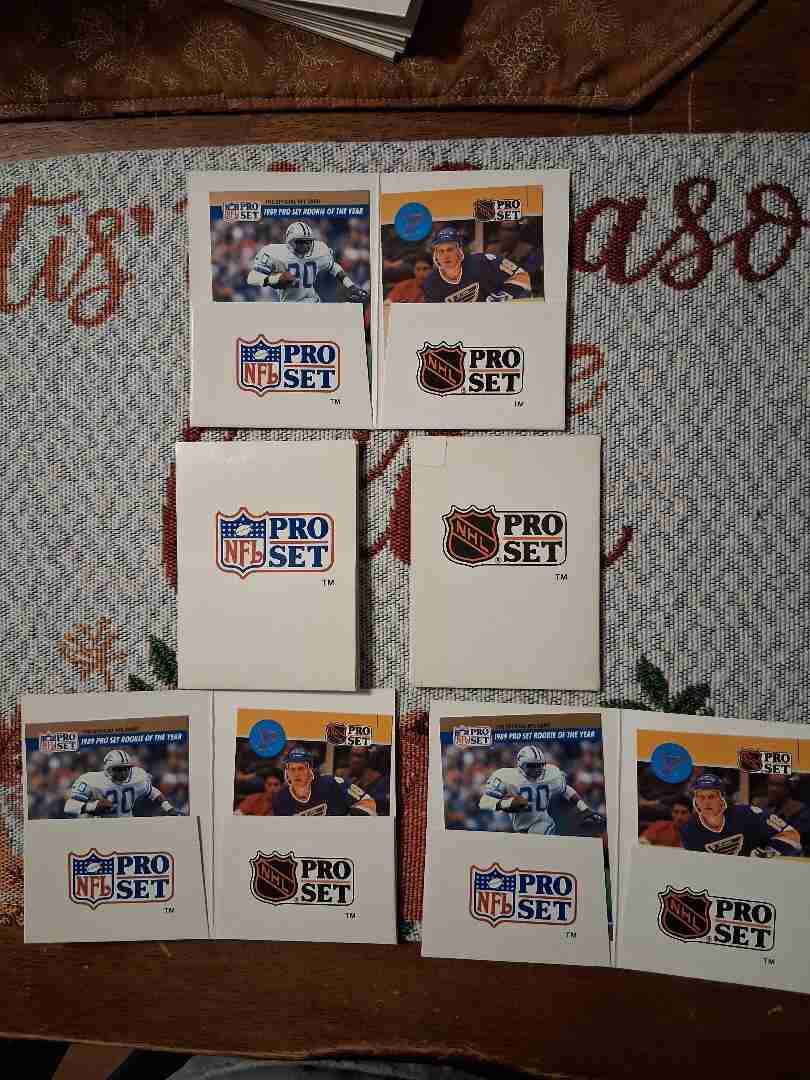 This Auction is for five (5) sets of two (2) 1990 Pro Set promo cards. The cards are the same in each folder. The cards are of Detroit Lions Barry Sanders, 1989 Pro Set Rookie of the Year 5 cards. Also included are five (5) cards of St Louis Blues Brett Hull. All cards are still in the original Pro Set Pack.