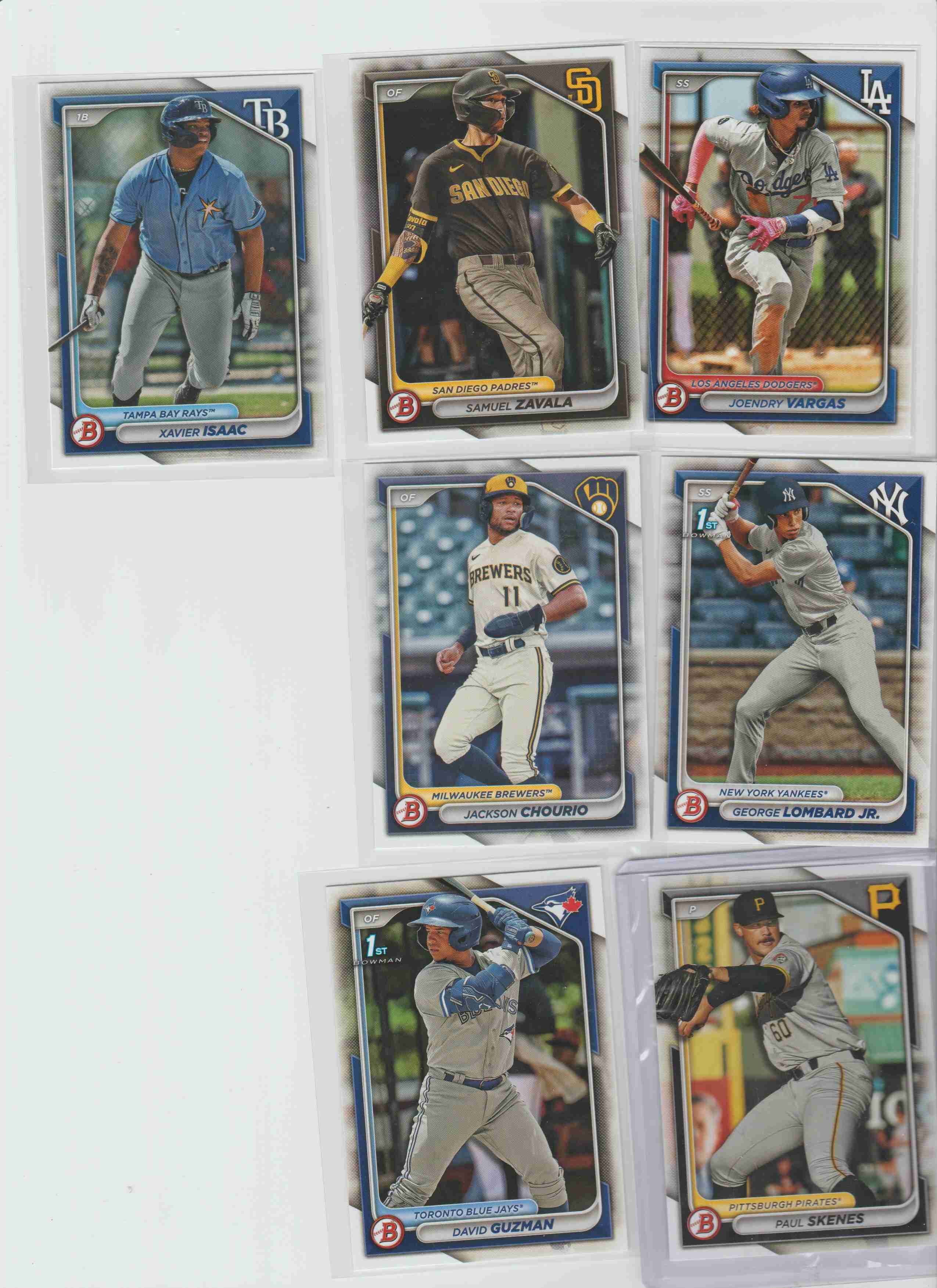 YOU ARE BIDDING ON A COMPLETE SET OF2024 BOWMAN PROSPECTS1-150 ALL CARDS ARE SLEEVE FOR PROTECTION KEY CARD IS PAUL SKENES#125, ALSO SEE SCAN FOR SOME OF TODAY OTHER STARS, HAPPY BIBBING