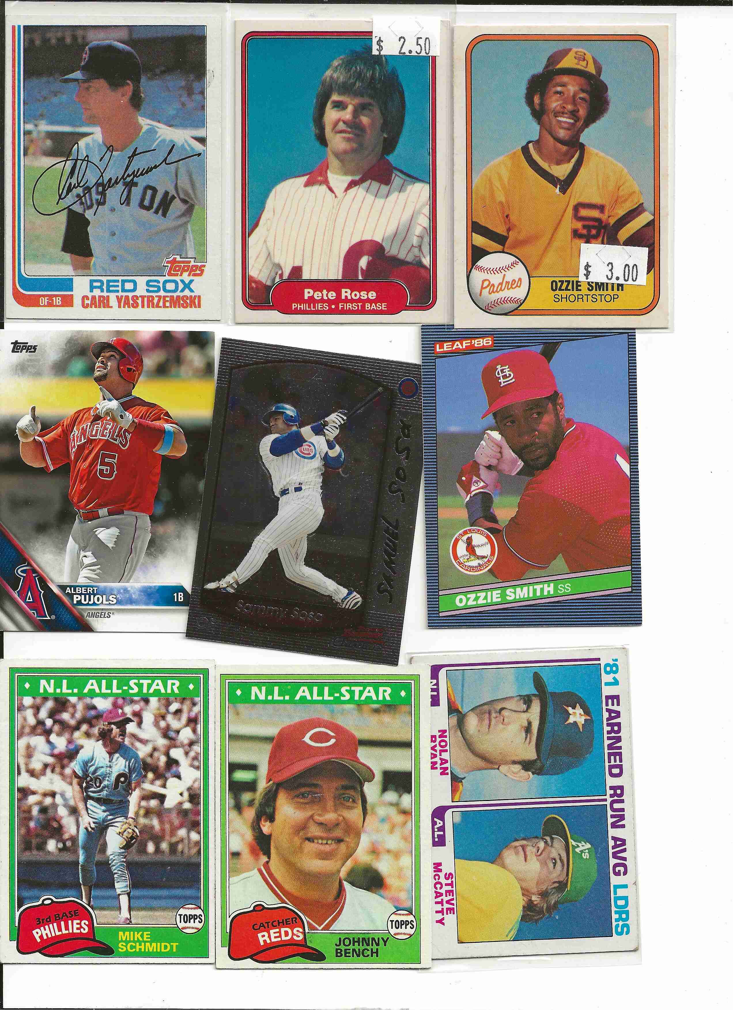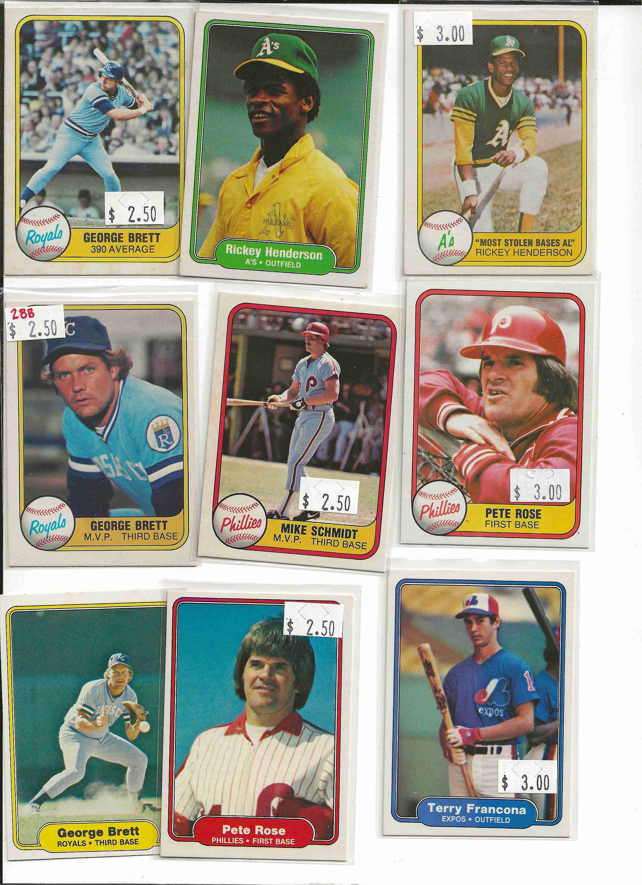 Some 81 82 Topps Donruss Fleer stars include Brett Henderson Schmidt Rose Francona RC other yesrs adn brands include Chipper Jones Clemens Yelich Ramirez Yount Ryan McGwire sosa