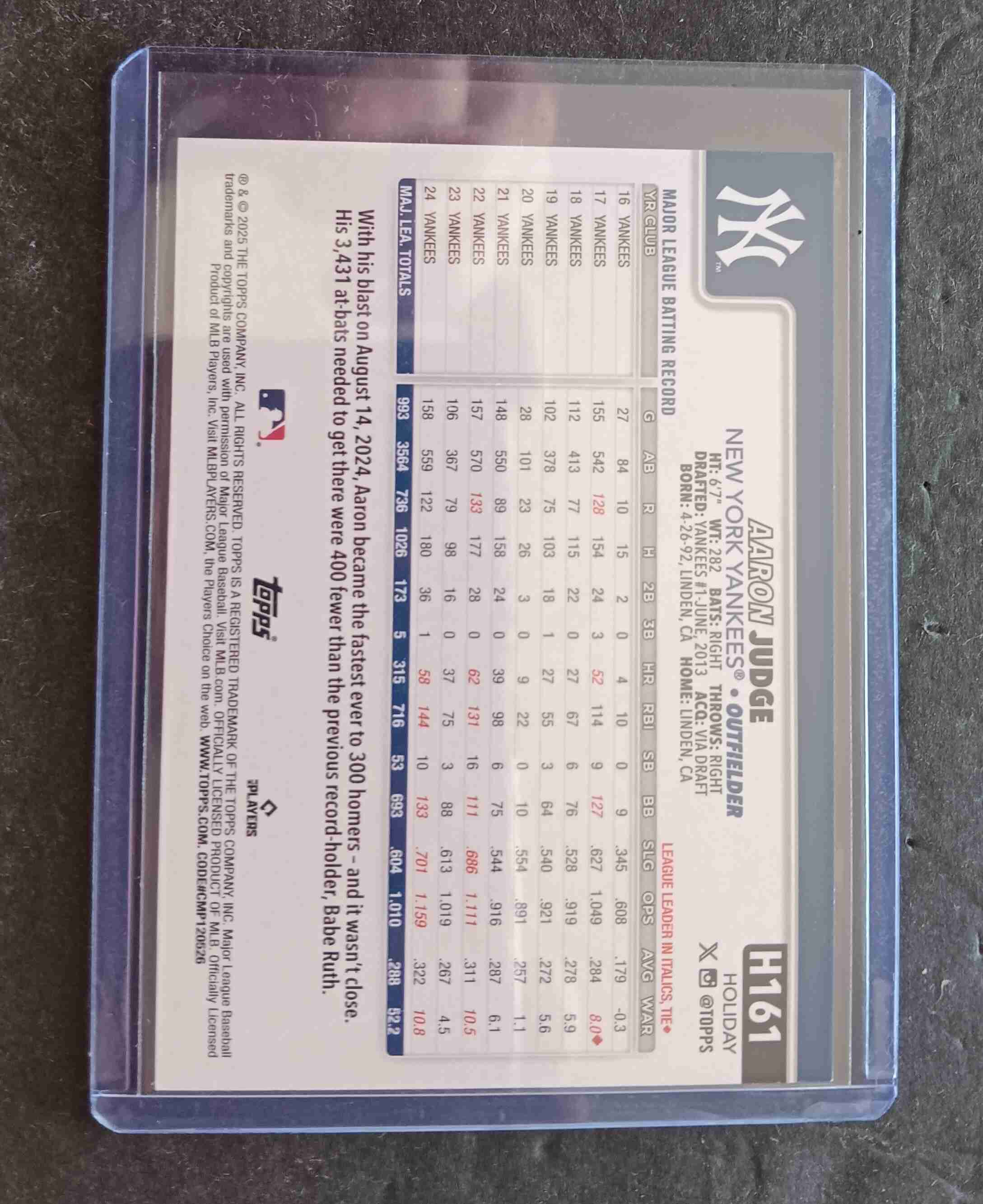 This auction is for a 2025 Topps Holiday Aaron Judge Gray Glitter Parallel.Card is number #H161,and is in NM condition.Thanks for looking.