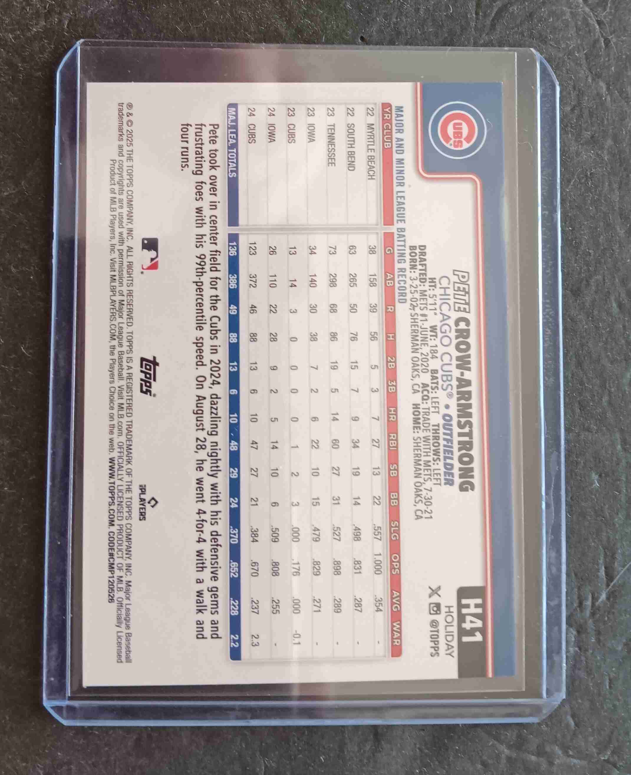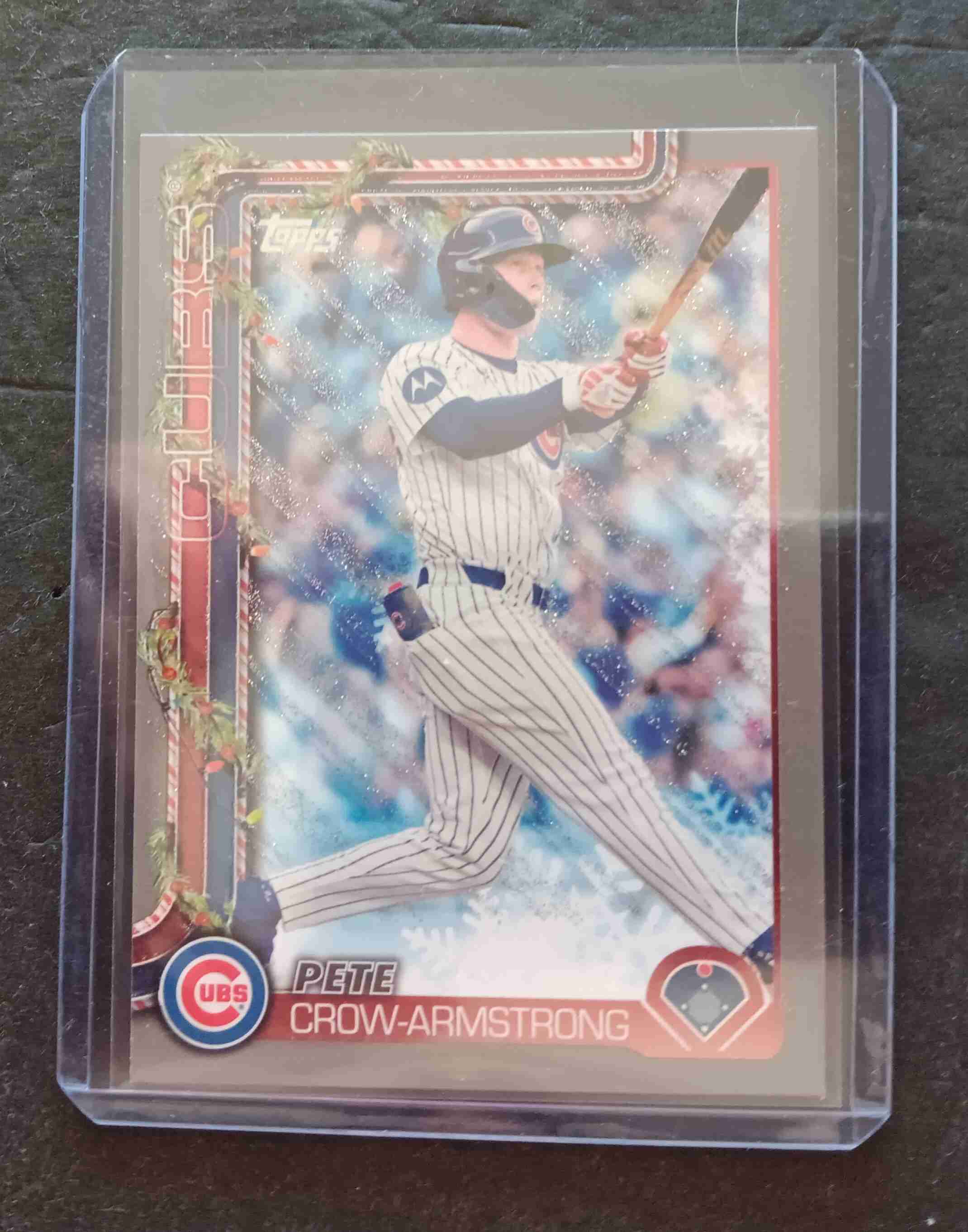This auction is for a 2025 Topps Holiday Pete Crow Armstrong Gray Metallic Parallel.Card is number H41,and is in NM condition.Thanks for looking.