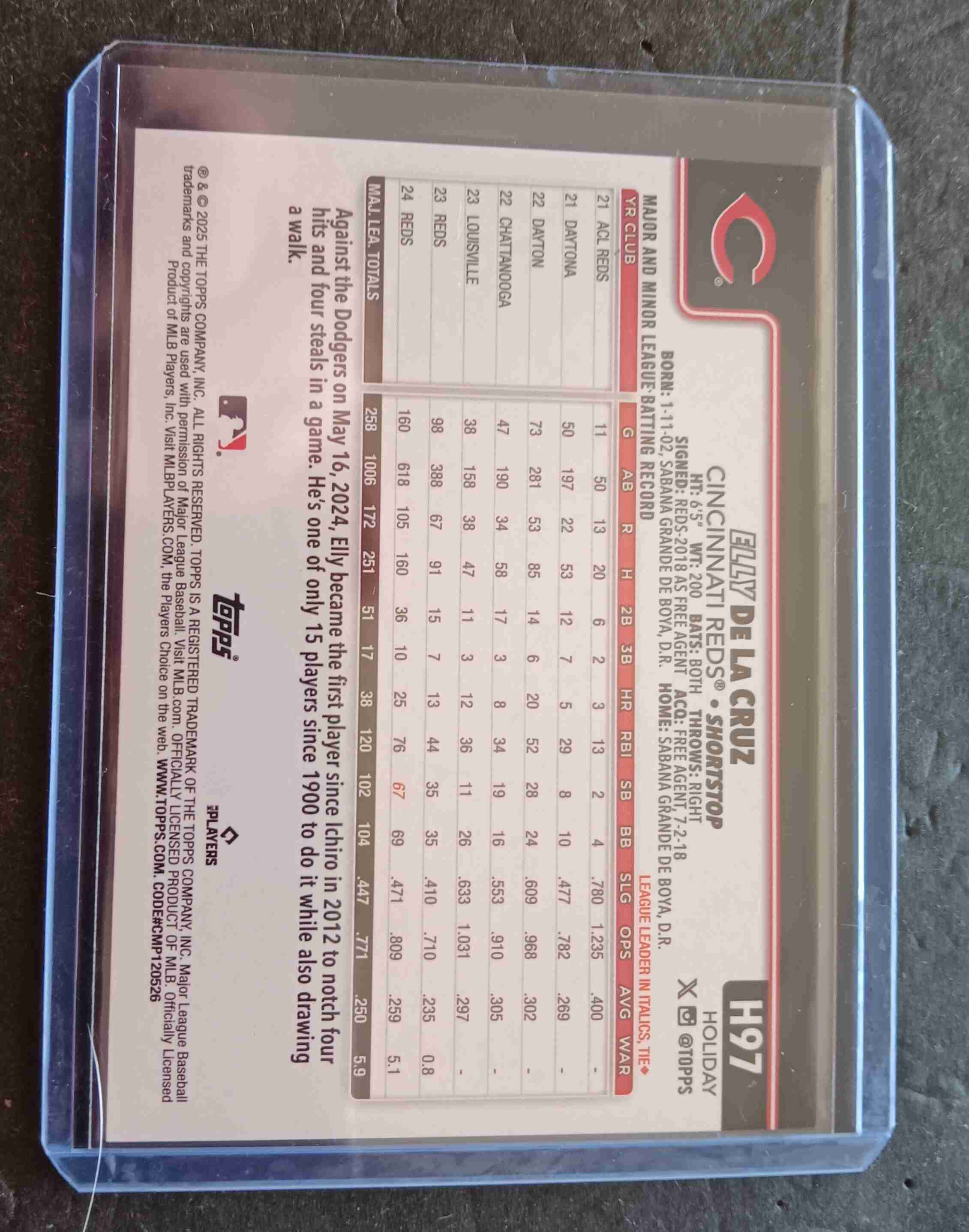 This Auction is for a 2025 Topps Holiday Elly De La Cruz Gray Metallic Parallel.Card is number #97,and is in NM condition.Thanks for looking.