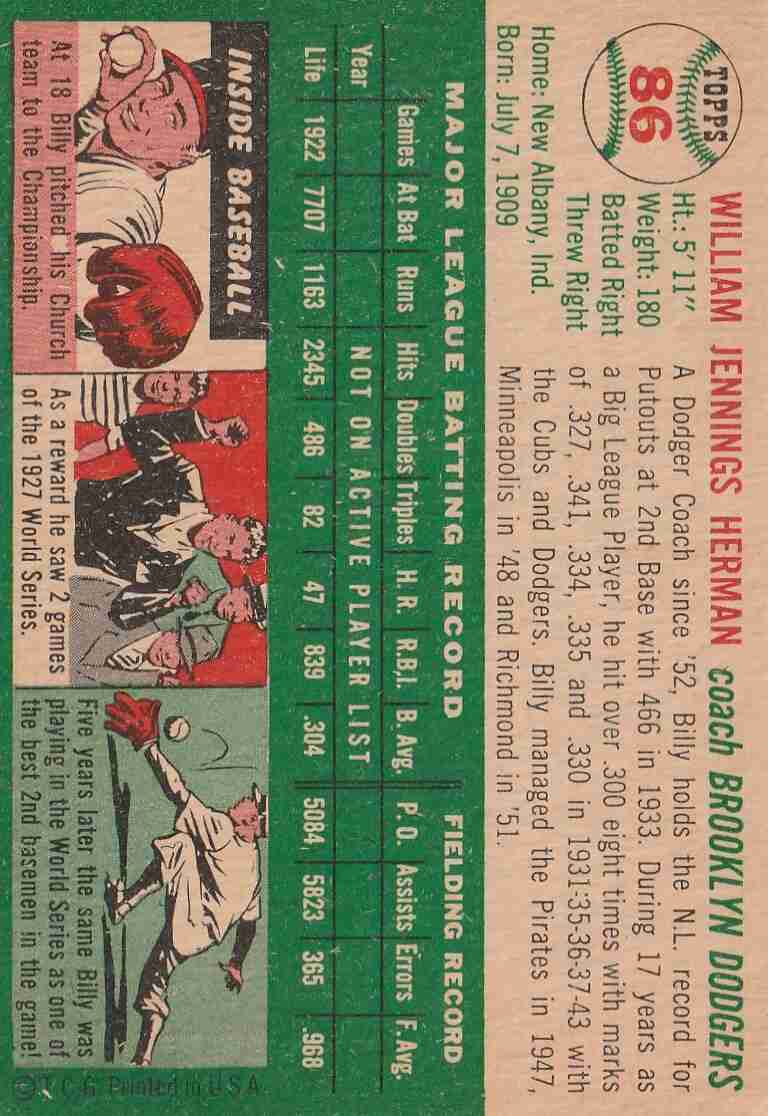 1954 Topps #86 Billy Herman Brooklyn Dodgers