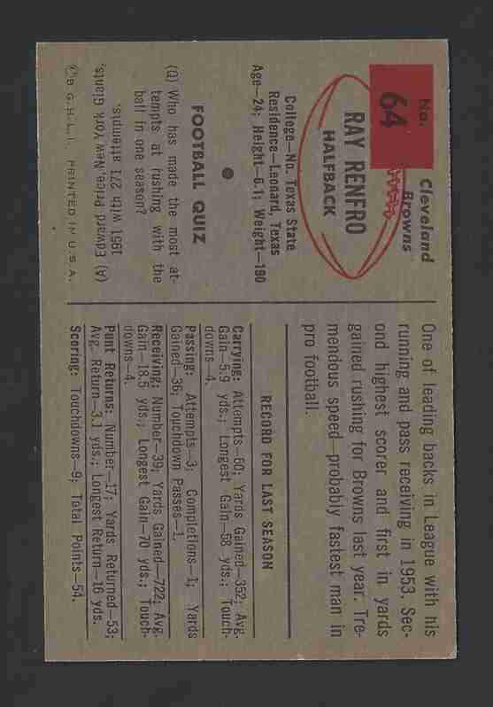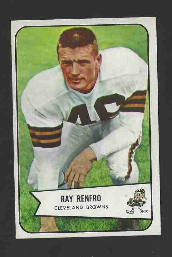 1954 Bowman Ray Renfro -#64- Browns. This is a higher-grade card. Card has minor flaws - nice corners. Nice shape for this era. Ships no tracking. Please review scans carefully for condition.