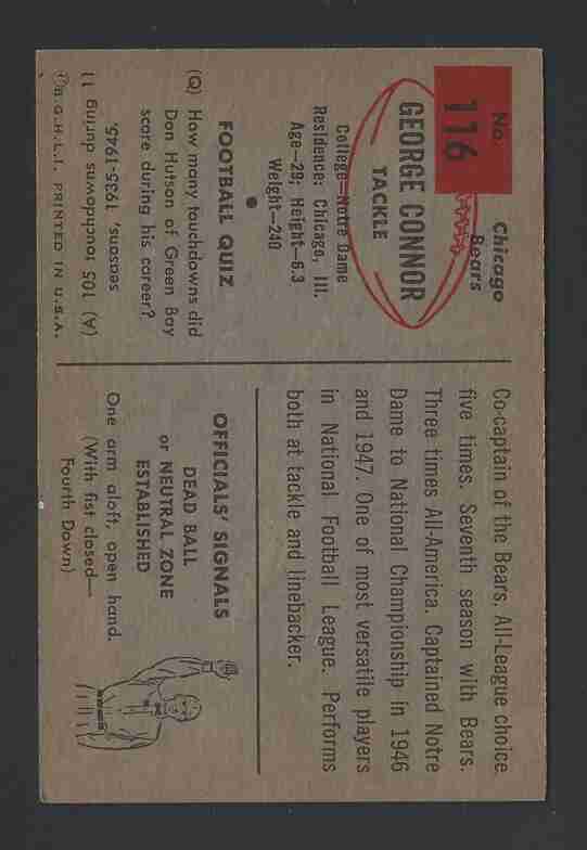 1954 Bowman George Connor (HOF) -#116- Bears. This is a higher-grade card. Card has minor flaws - nice corners. Nice shape for this era. Ships no tracking. Please review scans carefully for condition.