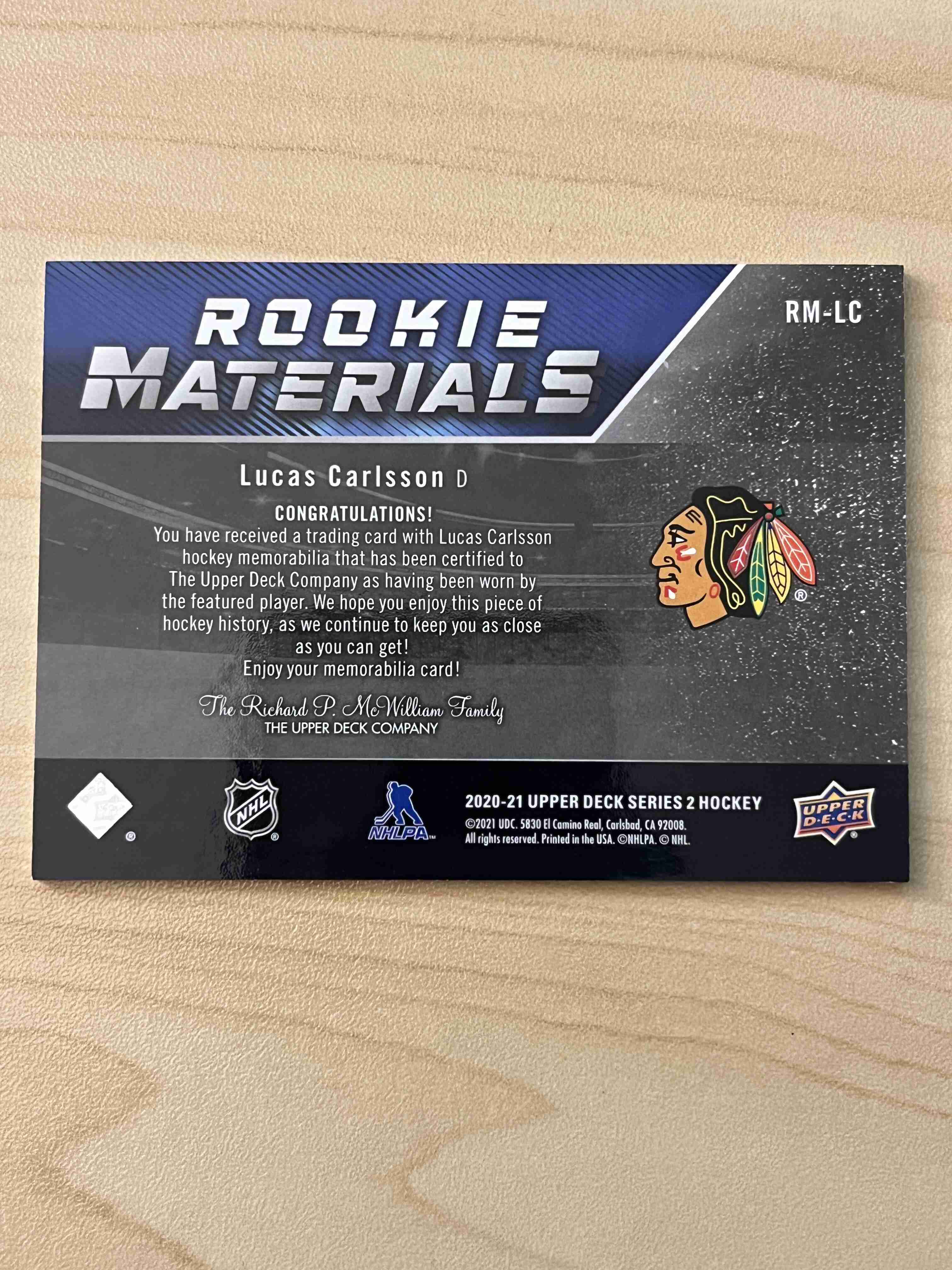Lucas Carlsson 2020-21 Upper Deck Rookie Materials Jersey