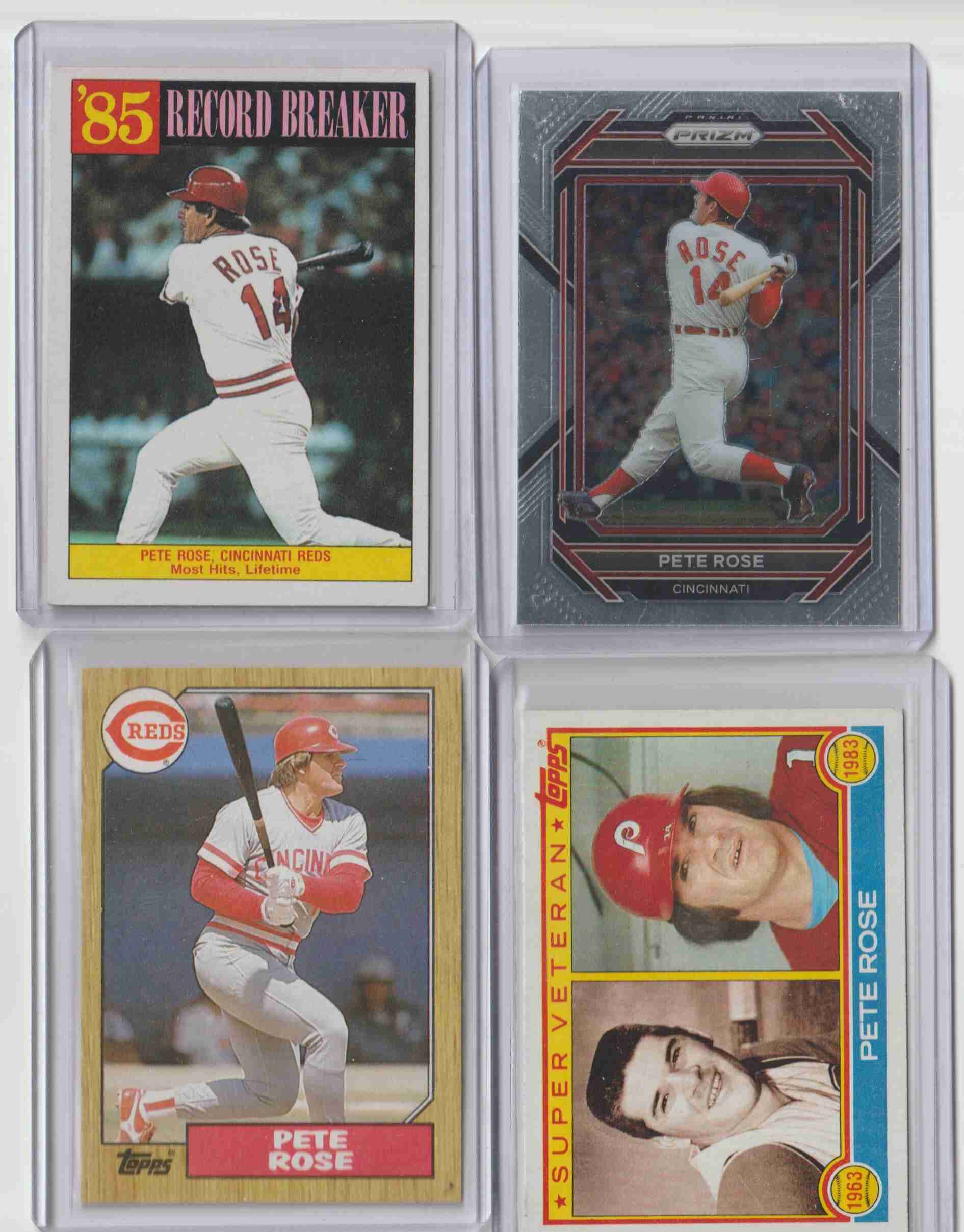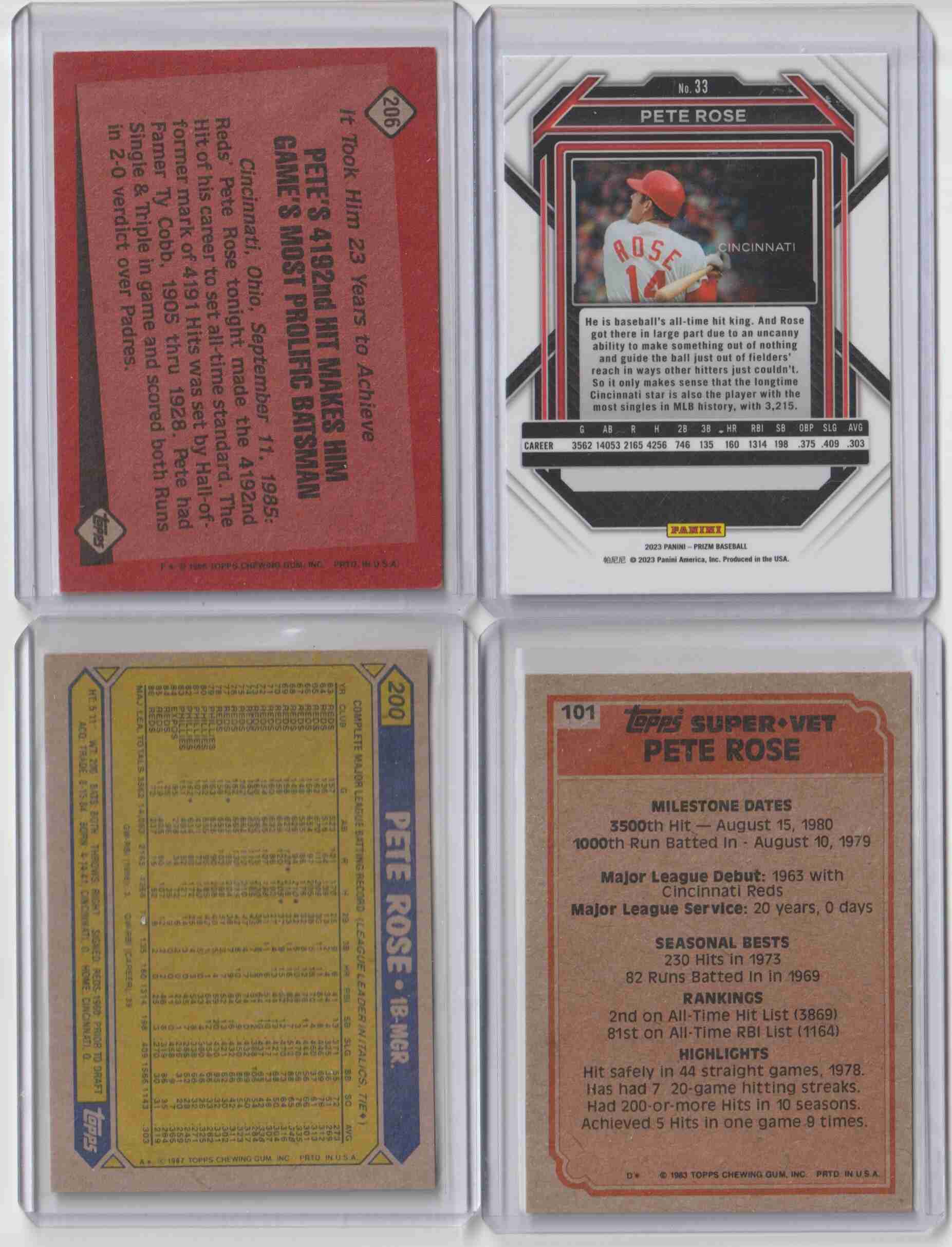 Pete Rose 4 Card Lot 1983T #101 Super veteeran 1986T #206 Record Breaker 1987T #200 Player Card 2023 Prizm # 33