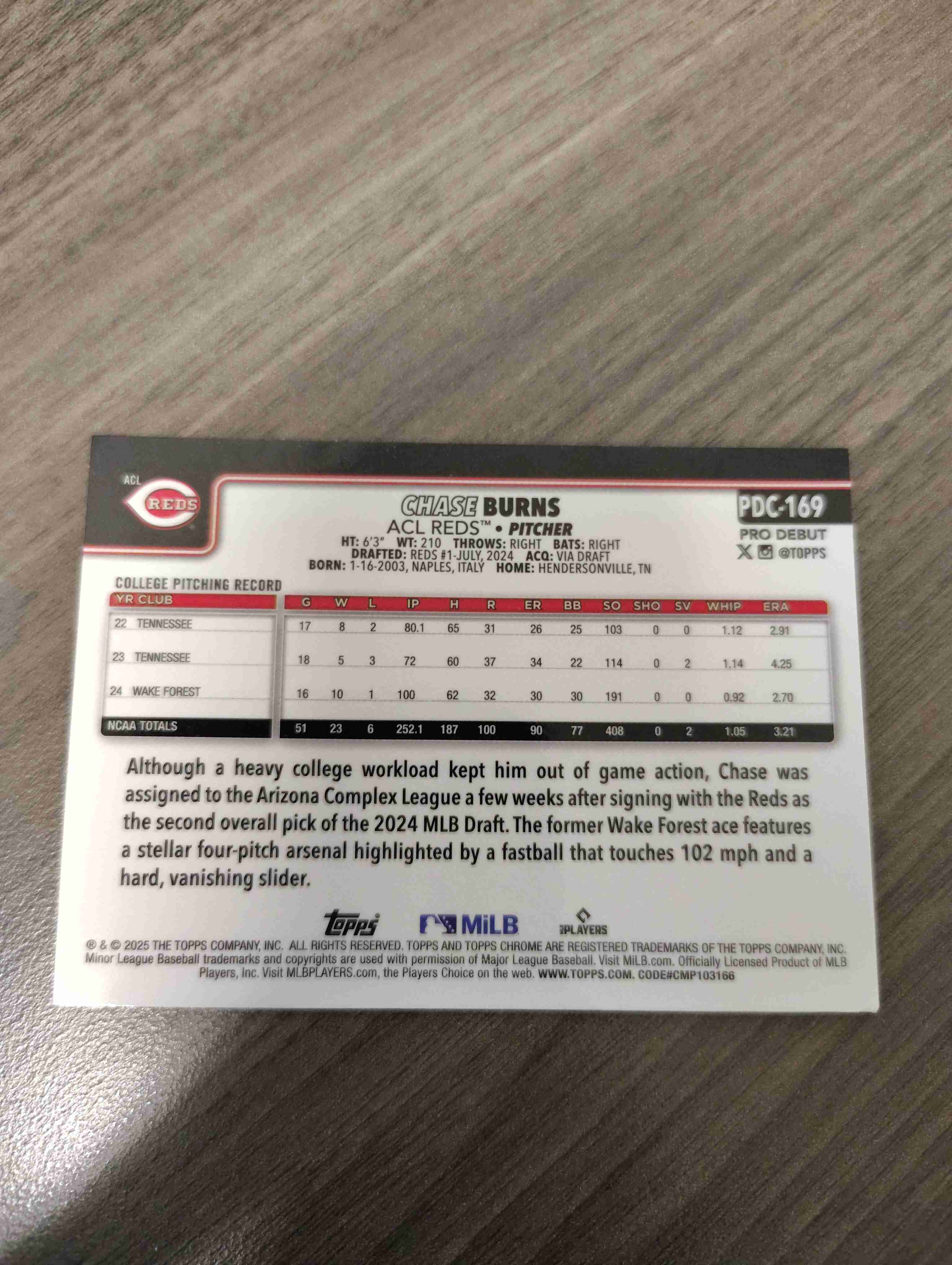 Chase Burns 2025 Pro Debut Chrome Bottom right corner slightly dinged out of the pack