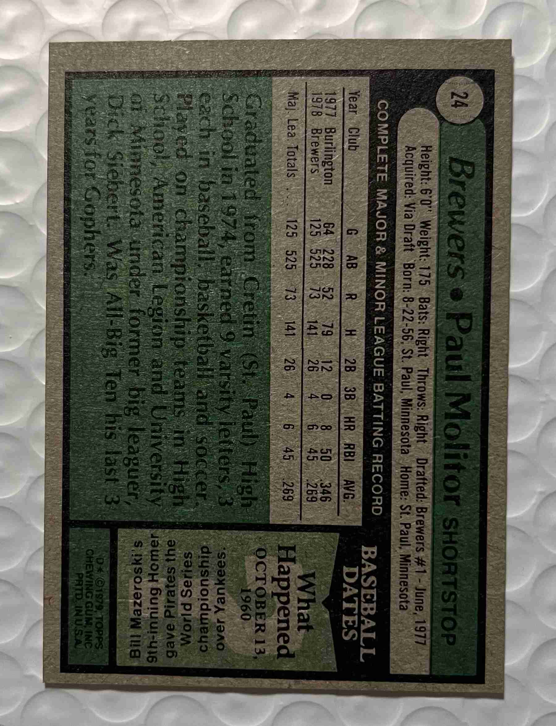 This auction is of a 1979 Topps Paul Molitor card. Card is off center but in Nrmt condition. Look at the pics and judge for yourself. If any questions please feel free to contact me. Thank you for looking at my auctions.