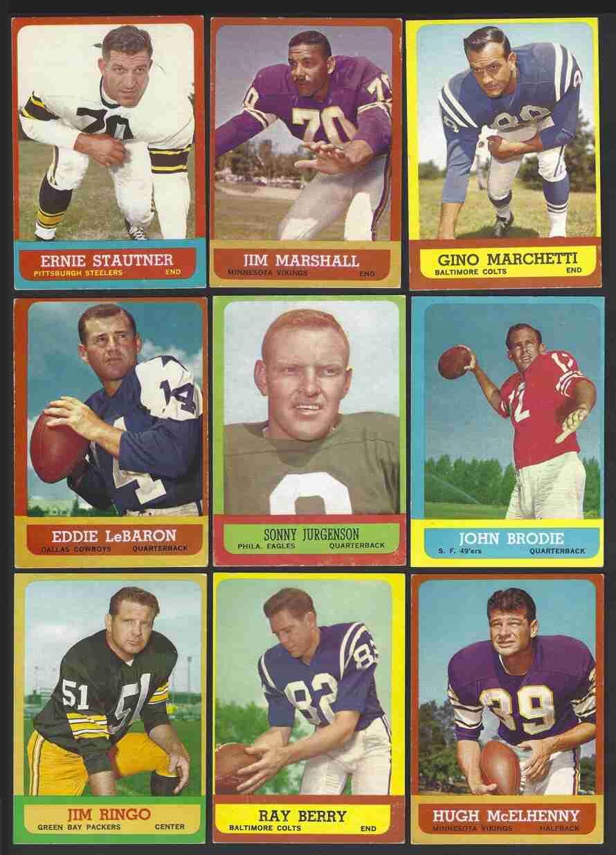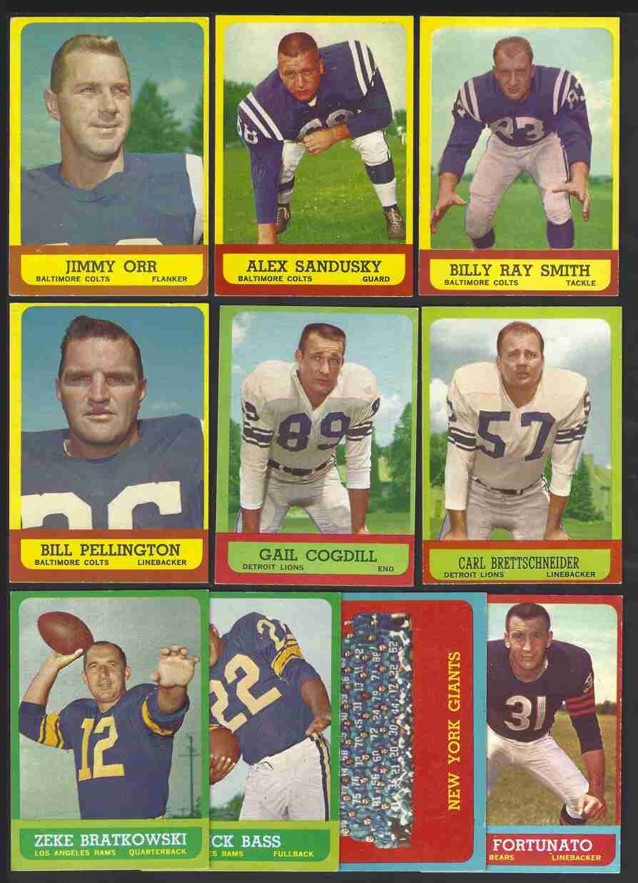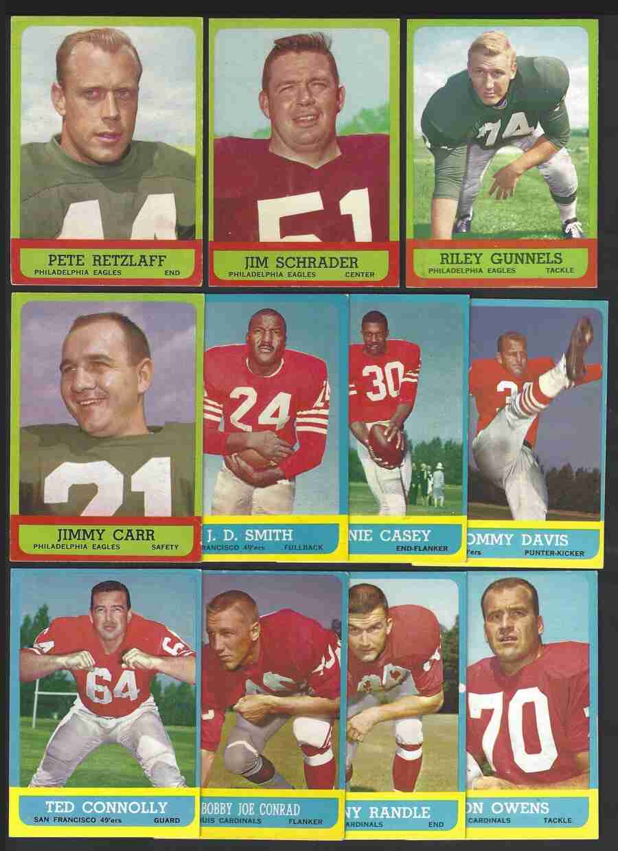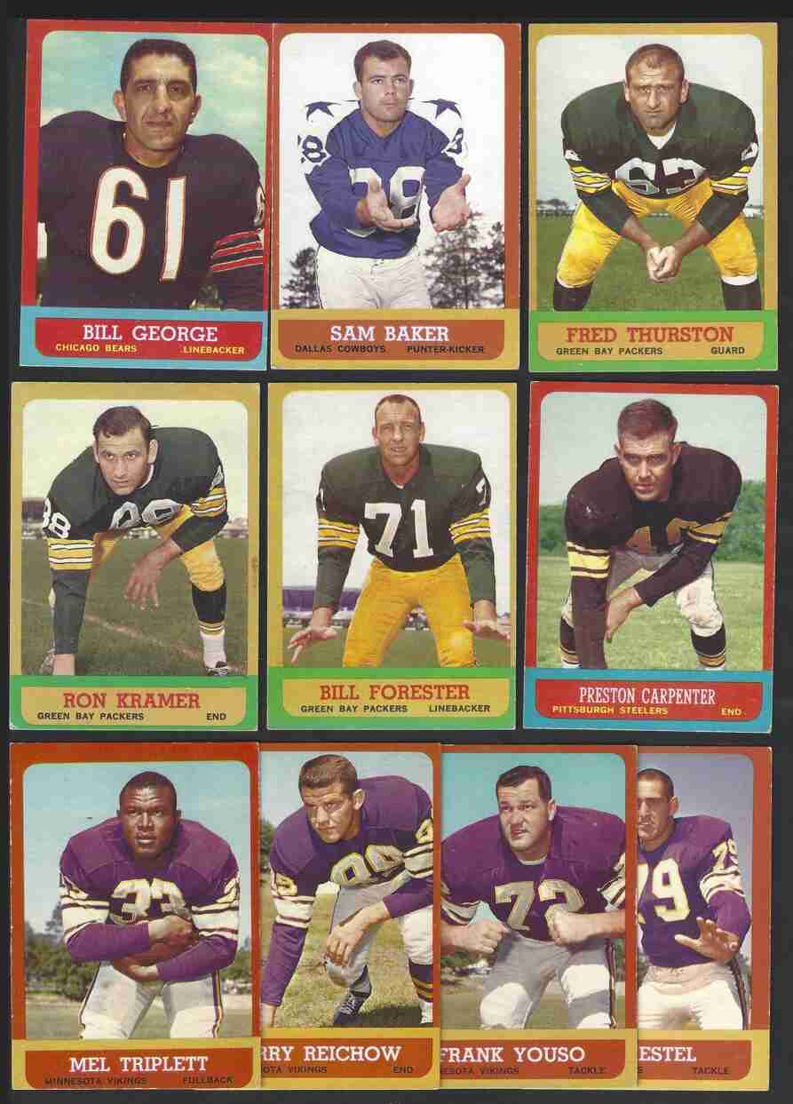 1963 Topps Football Lot (40). No's-3,4(HOF),6,8(HOF),9,10,28,31,38,39,60,69, 70(HOF),73(SP),79(SP),90,91(HOF,92,94,100,101,102,103(HOF),107(RC),108, 110(SP-HOF),114(SP),115(SP),119(SP),120(SP),126(SP),129(SP-HOF),134,135,137, 138,139,148,149,156. Excellent large lot of 1963 Topps Football cards. Lot includes Hall of Famers, Rookies & scarce SP's. Cards are in the mid-grade range. Cards have minor flaws. Nice shape for this condition-sensitive set. Please review scans carefully for condition.