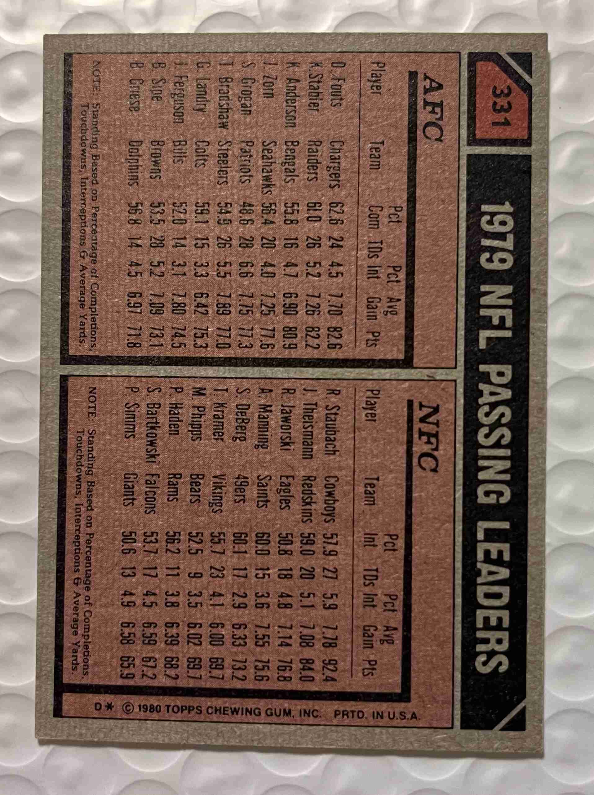 This auction is of a 1980 Topps “1979 Passing Leaders” card. Card is in Ex condition. Look at the pics and judge for yourself. If any questions please feel free to contact me. Thank you for looking at my auctions.