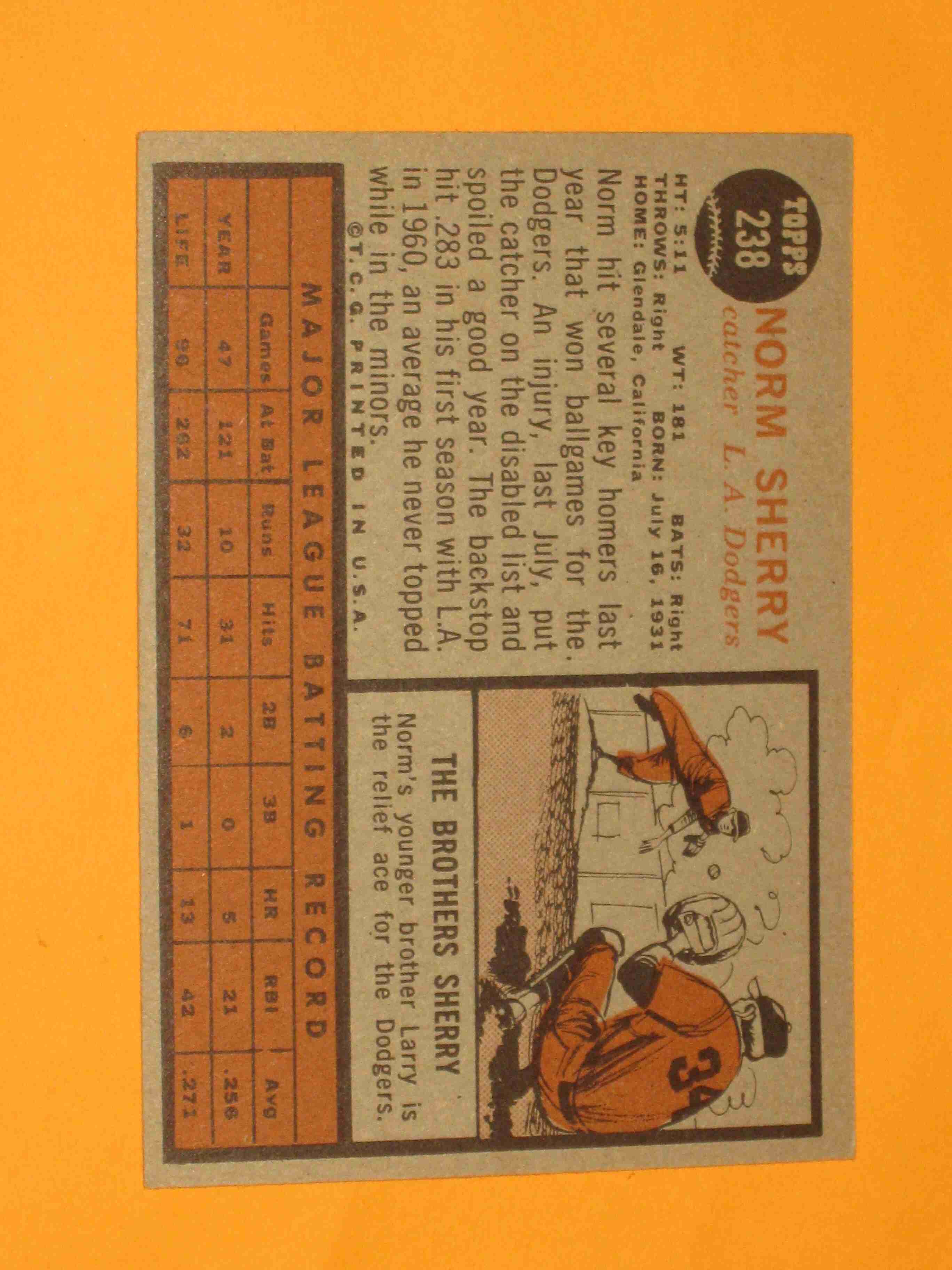 1962 Topps Norm Sherry #238 Los Angeles Dodgers NICE