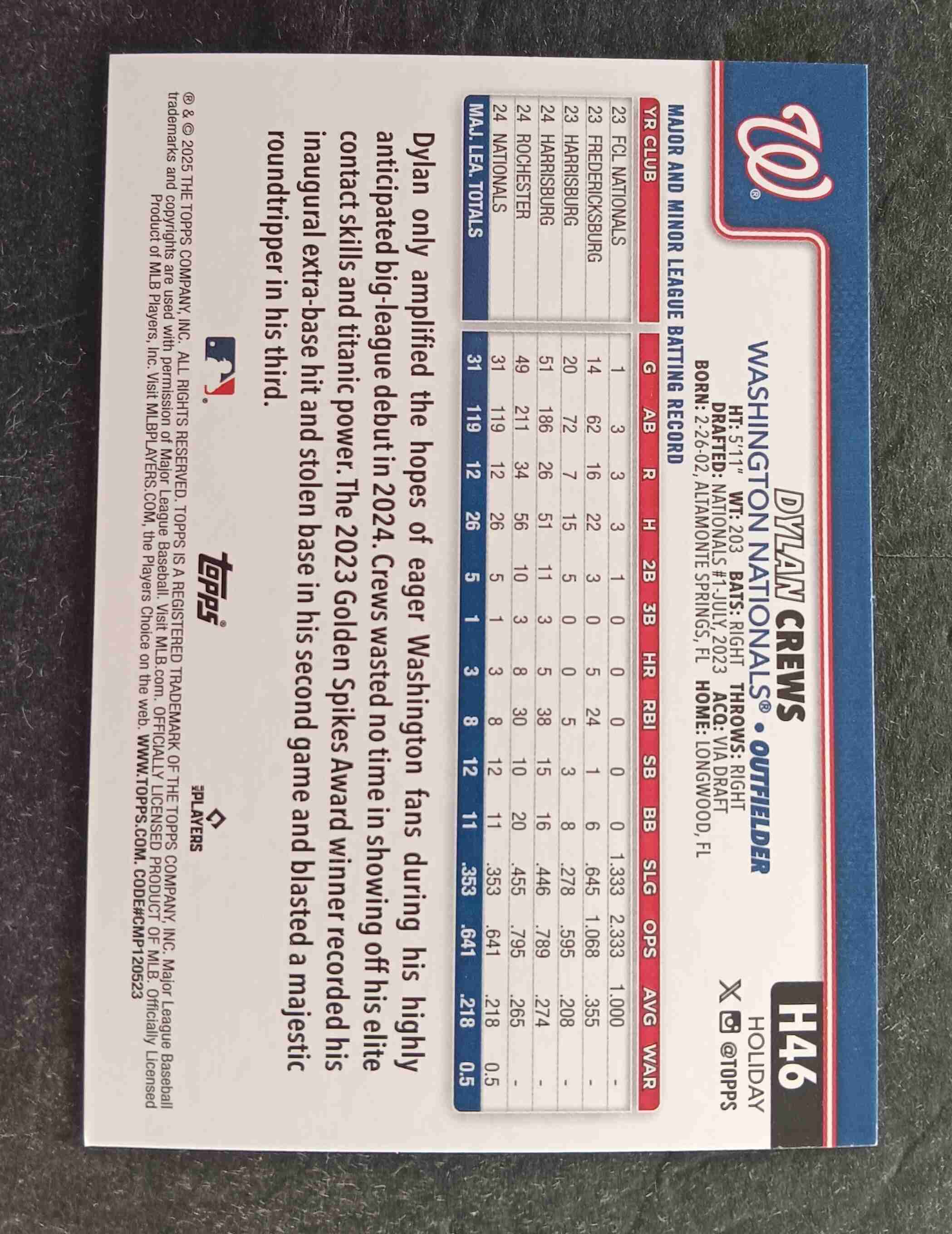 This auction is for a 2025 Topps Holiday Dylan Crews RC,Santa Hat Variation.Card is number #H46,and is in NM condition.Thanks for looking.