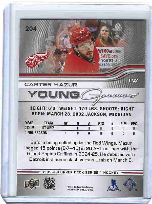 2025/26 UD 1 #204 CARTER MAZUR YOUNG GUNS