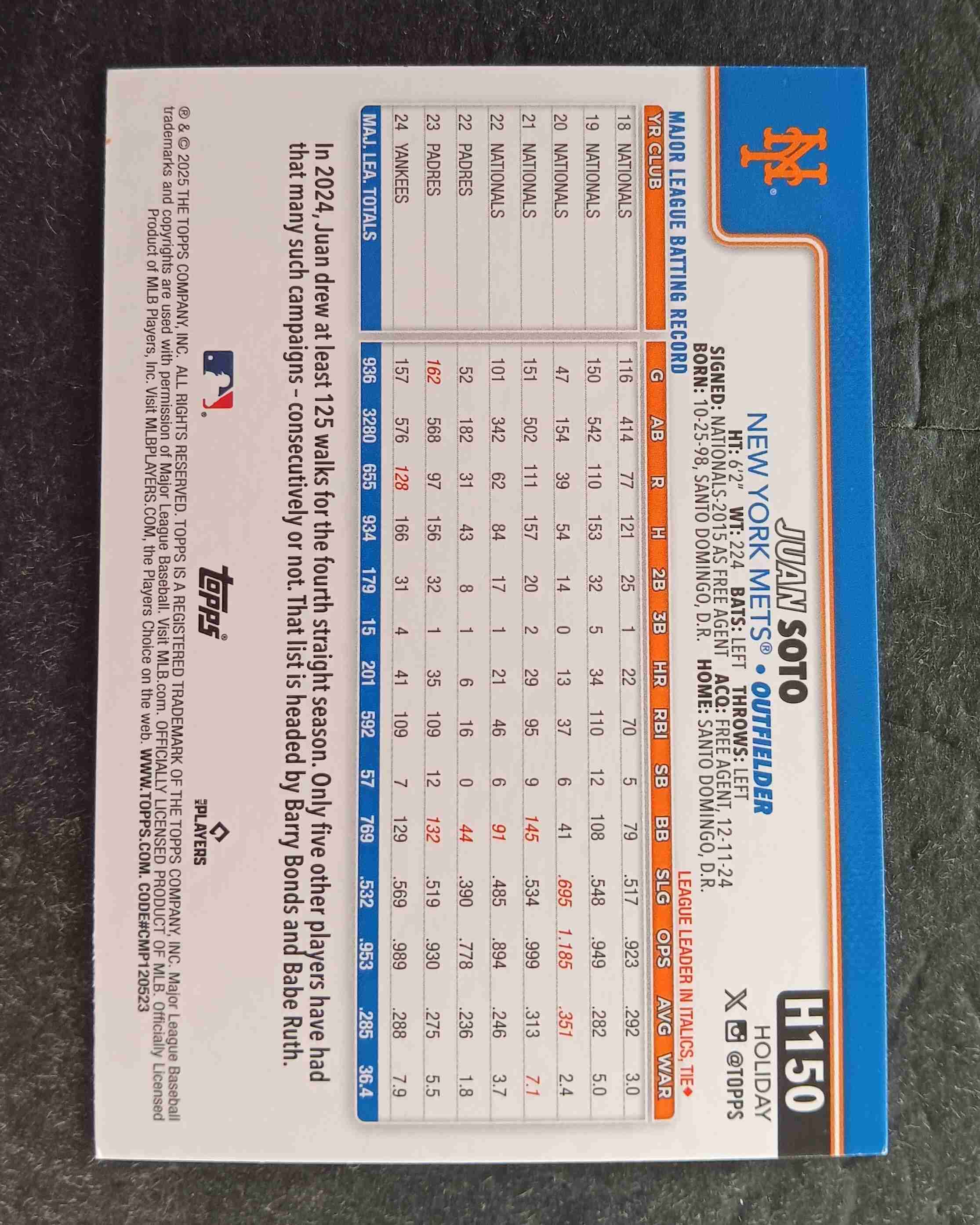 This auction is for a 2025 Topps Holiday Juan Soto Candy Cane Bat Variation.Card is number #H150,and is in NM condition.Thanks for looking.