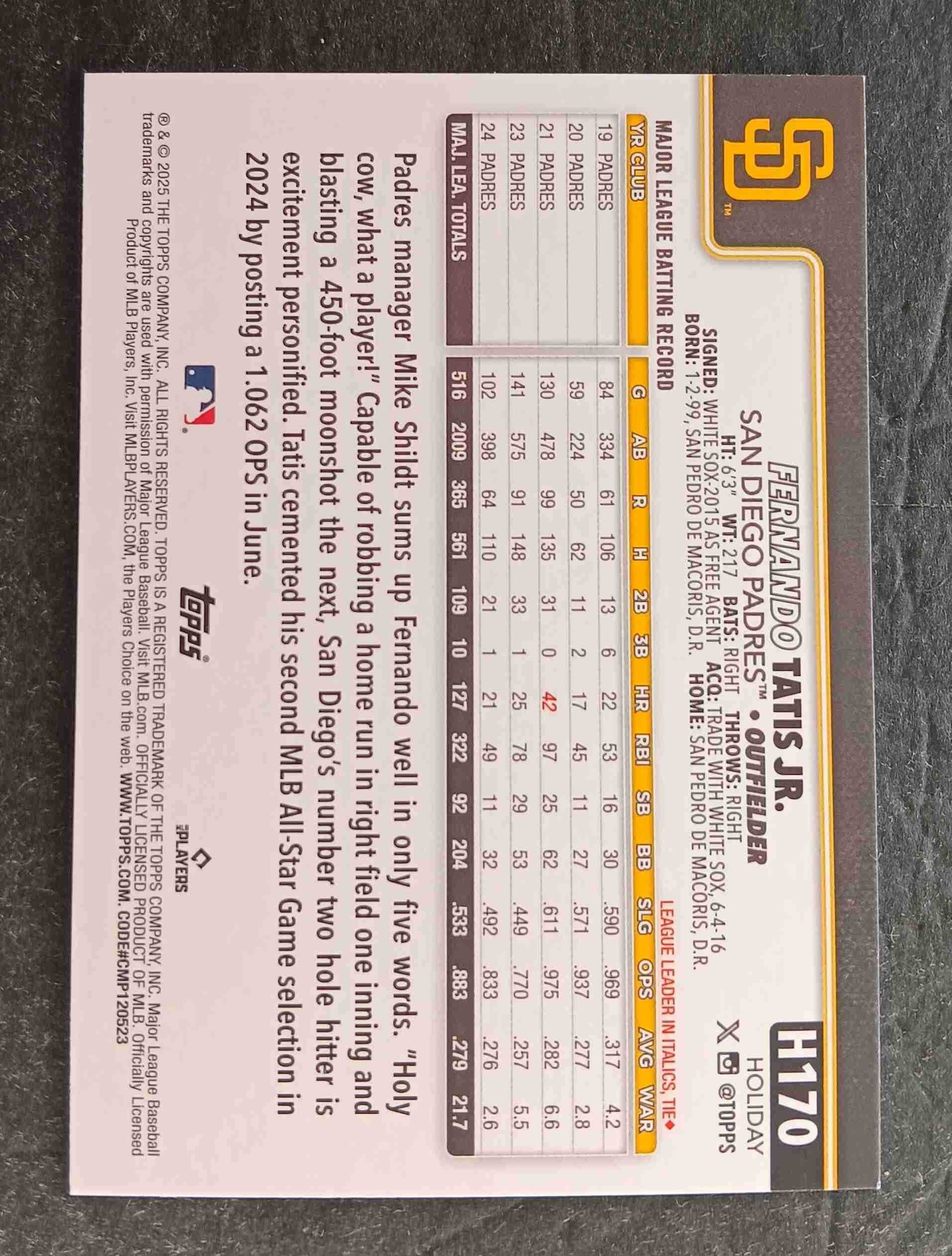 This auction is for a 2025 Topps Holiday Fernanado Tatis Jr. Lights Necklace Variation.Card is number H170,and is in NM condition.