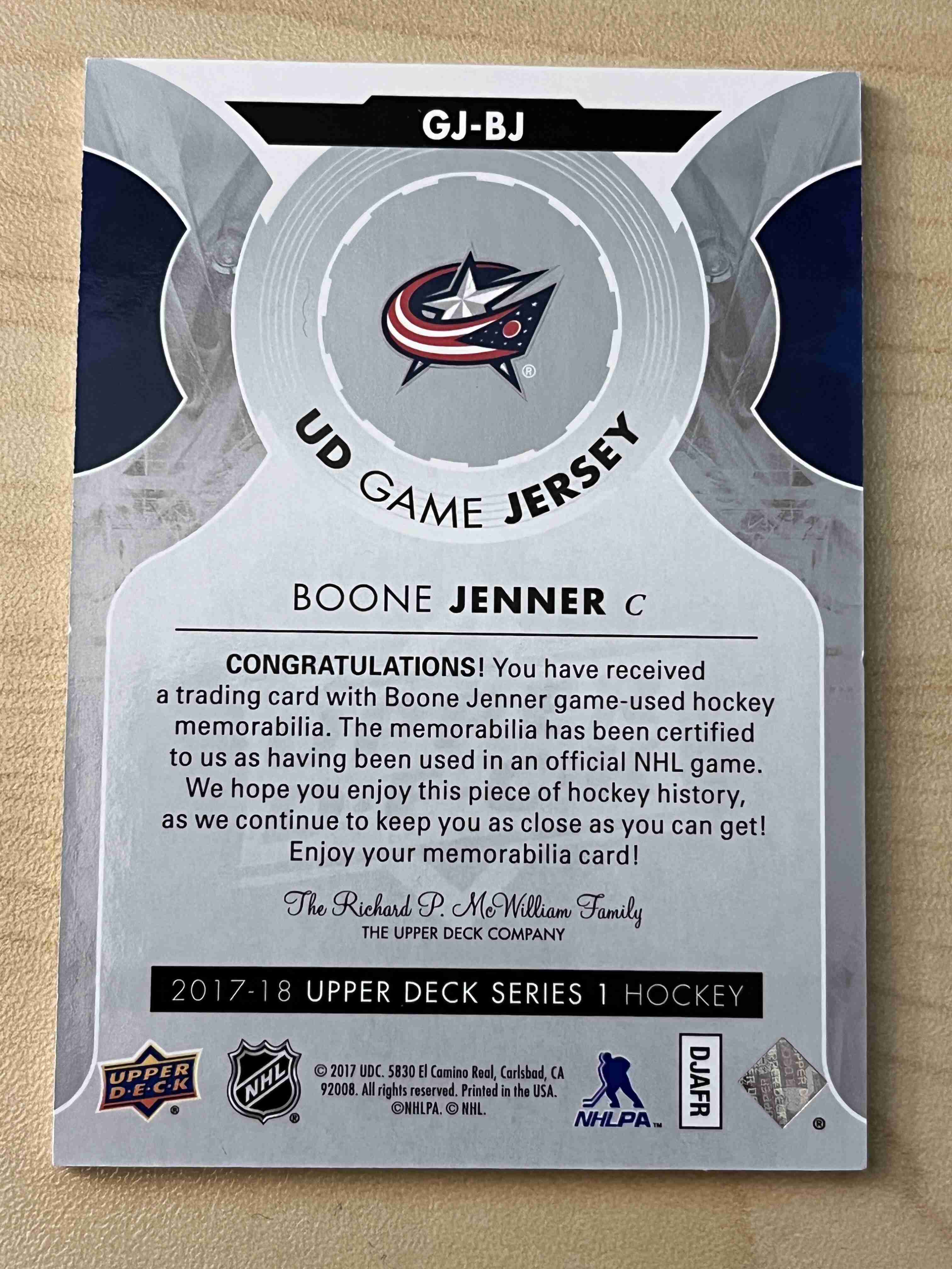 Boone Jenner 2017-18 Upper Deck Game Jersey #GJ-BJ