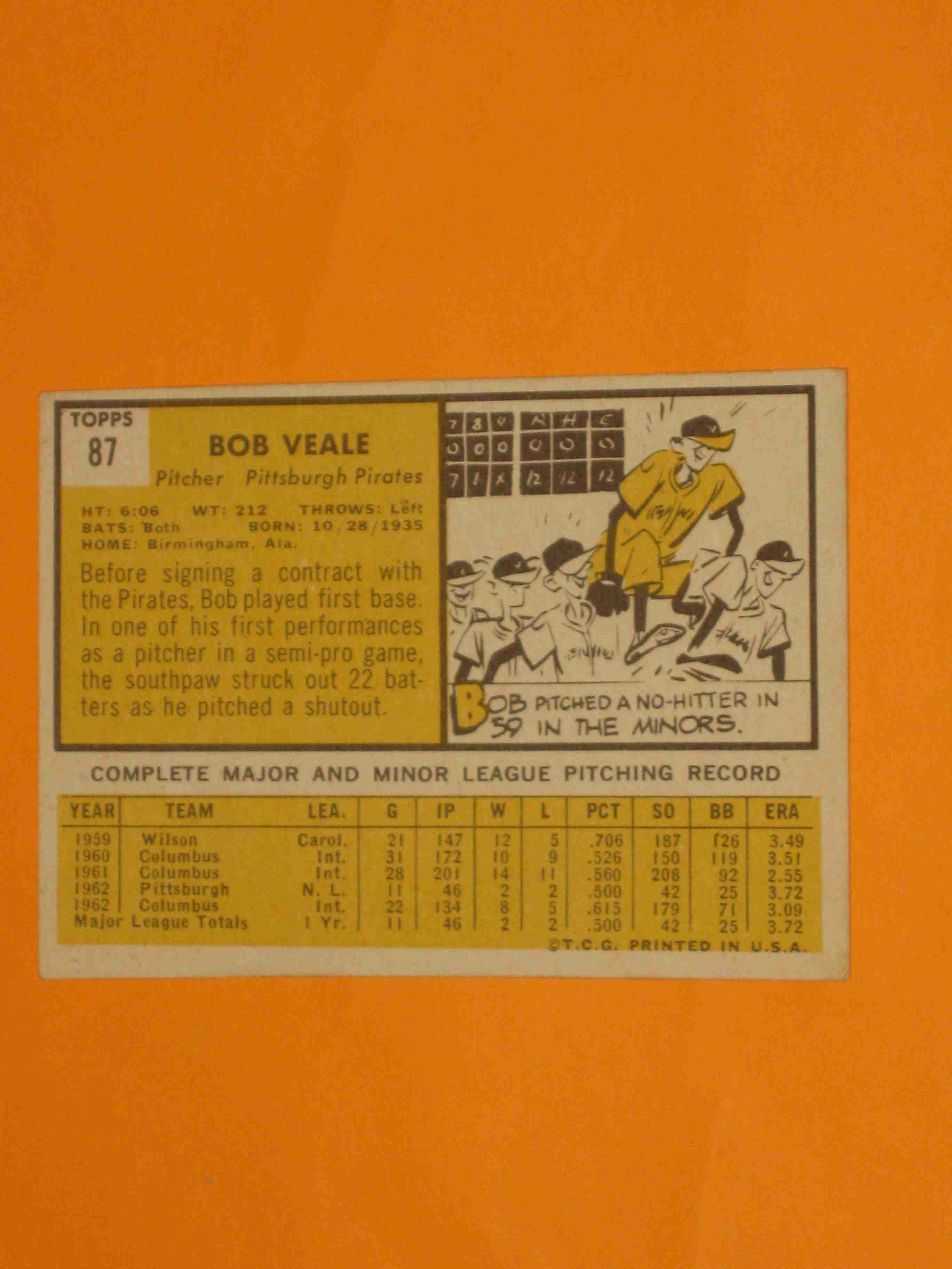 1963 Topps Bob Veale #87 Pittsburgh Pirates NICE