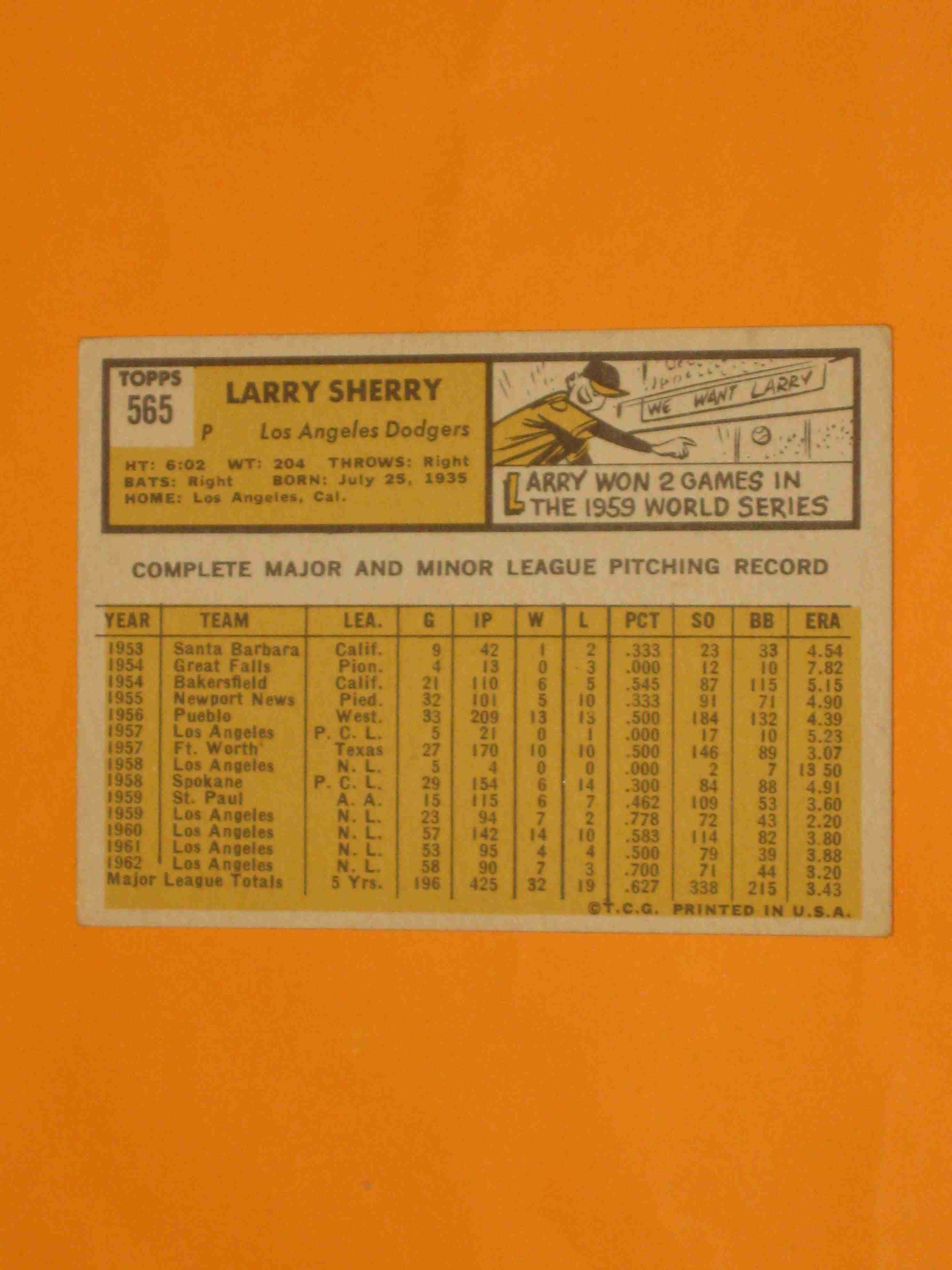 1963 Topps Larry Sherry #565 Los Angeles Dodgers HIGH#